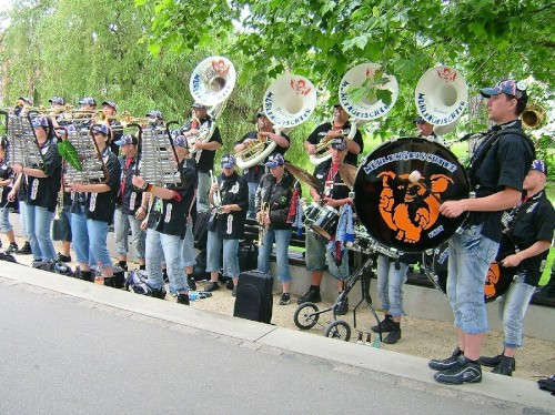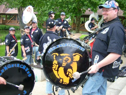 Es folgt noch ein kurzes Stück durch ein Industriegebiet, bevor am Eingang zum Donaupark die „Mühlengeischter“ mit ihrer schrägen Guggenmusik Stimmung machen. Entweder hören die schlecht oder sind be... Der eine hat gar eine Halterung für ein Bierglas an seinem Instrument angebracht. Die Musik gibt mir echt noch einen letzten Schub.