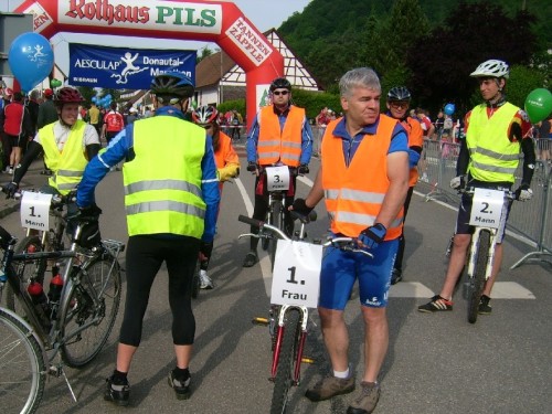 Startaufstellung kurz vor halb neun. Eine Kapelle bläst uns den Marsch, die letzten Mannschaftsfotos werden geschossen und die Führungsradler stehen auch schon in den Pedalen. Die Prominenz, darunter Aesculap-Boss Prof. Dr. Dr. Dr. Michael Ungethüm, wird noch mal interviewt. Aesculap ist in der Medizintechnik aktiv und sponsert die Veranstaltung. Zahlreiche Sportler stehen in Firmentrikots bereit. Ich habe den Eindruck, dass die ganze Region hinter dem Event steht. Es werden Luftballons ausgeteilt.