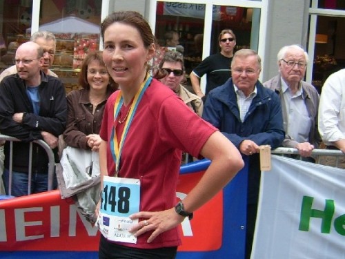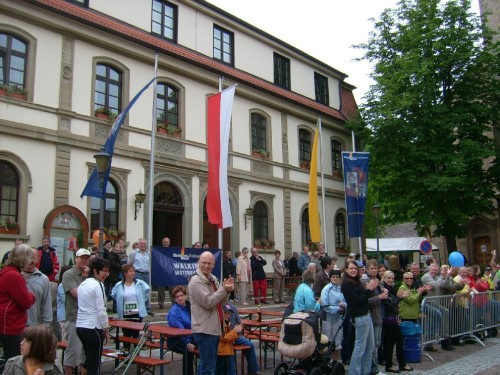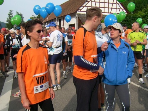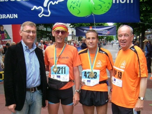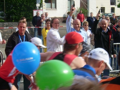 Der Pacer wartet, wir gratulieren uns gegenseitig. Ein Medaillenmädle hängt mir das Eisenteil um den Hals. Prof. Ungethüm steht in Laufklamotten ebenfalls im Zielraum. Ich wechsele ein paar Worte mit ihm. Und dann zum Pacer: „Kennst du diese Person?“ deute ich auf einen Mann. „Ne“. Und dann: „Haben Sie hier eine Funktion?“ frage ich. „Ich bin hier der OB.“ „Ja, dann gehören Sie auch aufs Foto, “ so kumm i grad no um d’Kurvn num.