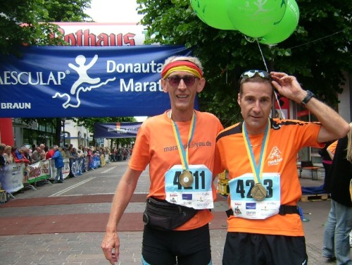Wir überqueren noch mal die Donau auf einer Brücke und nach einer Rechts-Links-Kombination sehe ich bereits das Zieltransparent. Ich motiviere noch mal die Zuschauer links und rechts zu einer Ola-Welle und laufe gut gelaunt am Marktplatz ein. Hollereiduljö.