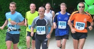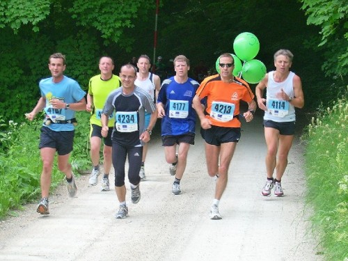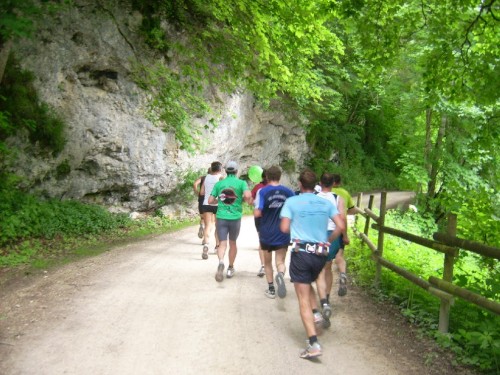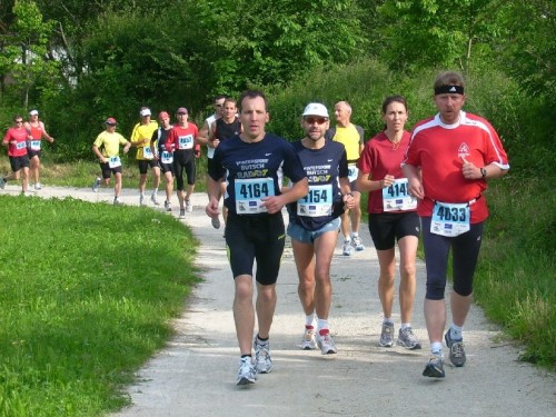 Kurz vor der Halbzeit entfernen wir uns von der Donau, es geht aufwärts. Ich gehe an der 3.30 Stunden-Gruppe vorbei, ich bin ja die Berge von gestern gewöhnt, und kann so mal das “Pack“ von vorne fotografieren. So rund zehn Athleten zählen wir jetzt.