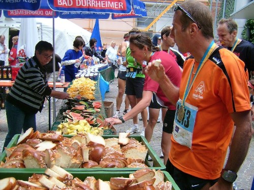 Ein paar Meter weiter um die Ecke finden wir die Zielverpflegung. Cola, Wasser, Schorle, Hefezopf, Melonen, Bananen, Orangen, genug für alle. Die Helfer laufen einem sogar noch mit Getränkenachschub nach. Das habe ich auch noch nicht erlebt. Ja und wie schaut’s mit der Zeit aus, höre ich schon wieder Fragen. 3.27.55 Stunden, und die zweite Hälfte sogar noch 21 Sekunden schneller als die erste. Passt scho, sagt der Bayer. Im TuWass können sich dann die Marathonis duschen und erholen. Das genieße ich, bevor ich mich nach einer gscheiten Brotzeit auf den Rückweg mache.