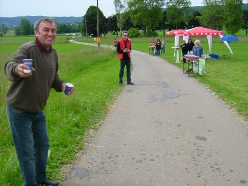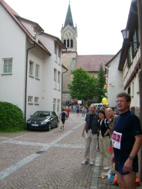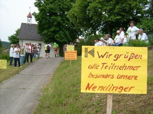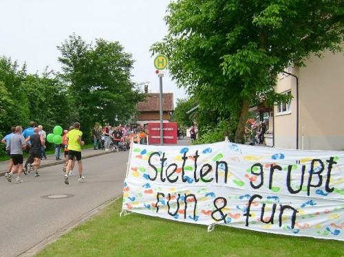 In Stetten (Kilometer 32) haben Bewohner ein Riesentransparent angebracht. „Stetten grüßt run & fun“, steht drauf. Und wieder haben Kinder ihre helle Freude. Zwei Kilometer weiter, in Neningen, sehe ich kurz vor einer Kapelle zahlreiche Schilder. Es werden besonders Einheimische angefeuert. Nach einem weiteren Wegstück haben die Nendinger ein Bierzelt fast auf der grünen Wiese aufgestellt. Eine super Stimmung. Nächstes Jahr sollte man hier Bier für die Läufer ausschenken. Und wenn der Gerstensaft knapp ist, dann wär ich schon mit ein paar Schlucken zufrieden, gell.