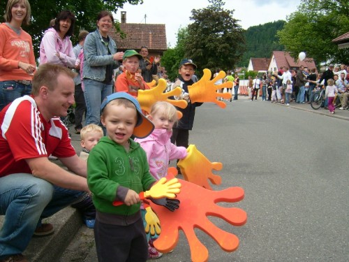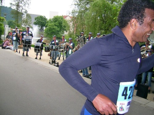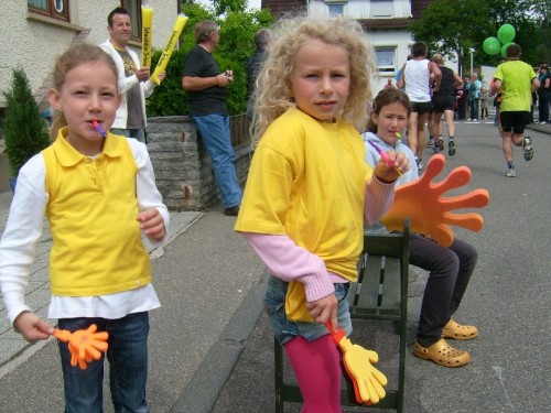 Kilometer 30, Mühlheim, nicht minder schön ist die Stimmung da zu erleben. Jetzt stehen die Anwohner staunend am Straßenrand und feuern uns an. Zahlreiche Kinder halten uns ihre Hände hin zum Abklatschen.