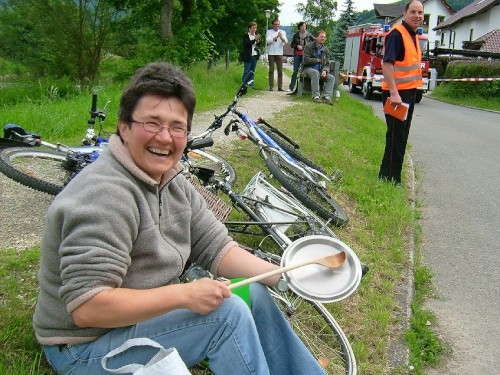 Schön abwechslungsreich gestalten sich die folgenden Kilometer. Grüne Wiesen, eine mäandrierende Donau, schattige Buchenwälder, Felsformationen und ein munteres Auf und Ab unserer Strecke machen unser Tagwerk zum Erlebnis. An der ersten Verpflegungsstelle stehen links und rechts Biertische mit eingeschenkten Getränken.