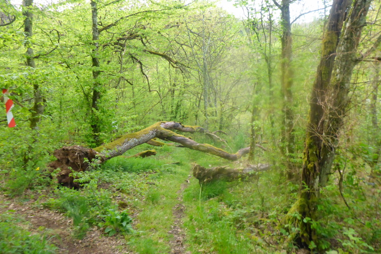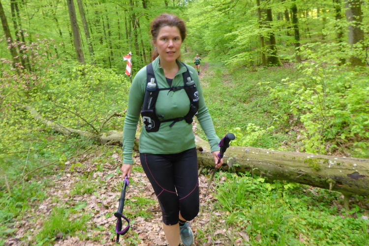 Der Asphalt endet und ein unebener Feldweg folgt. Mittlerweile enteilt das Feld. Weil ich niemanden vor mir sehe, bin ich gewarnt: der Weg zweigt in den Wald ab. Jetzt geht es tendenziell bergab. Der erste Baum liegt über der Strecke; es werden noch weitere folgen. Bei mir am Ende des Felds befinden sich noch zwei weitere Frauen. Ich bin also nicht ganz allein. Am ersten steilen Downhill werde ich überholt - alle Achtung! Das Mädel ist vielleicht schnell. Wir verlieren Ruckzuck 50 Höhenmeter.