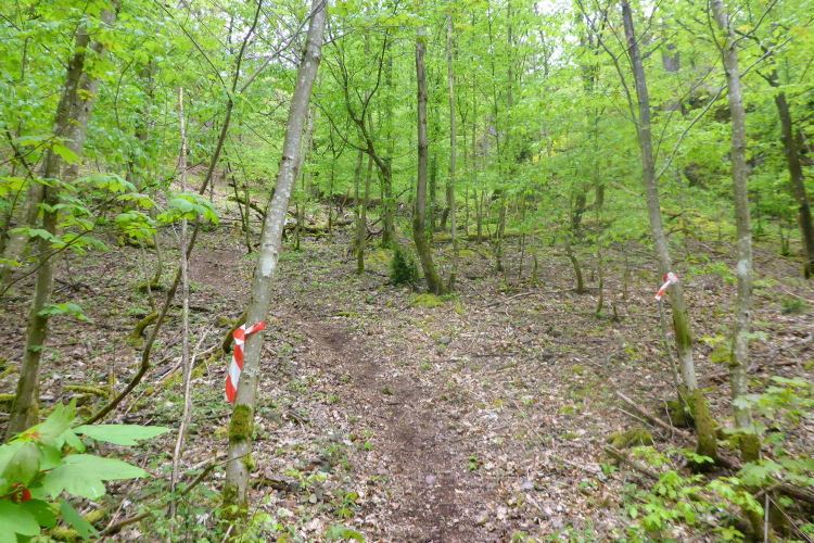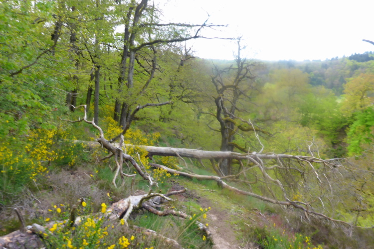 Im spitzen Winkel laufen wir richtungsmäßig wieder zurück, auf ansteigendem wilden Trail. Umgestürzte Bäume, Steine und Wurzeln durchziehen den Pfad. An dessen Ende entdecken wir eine Lichtung mit blühender Wiese. Der Weg führte durch hohes Gras. Der sonnendurchflutete Laubwald gestattet weiße und gelbe Blütenpracht.