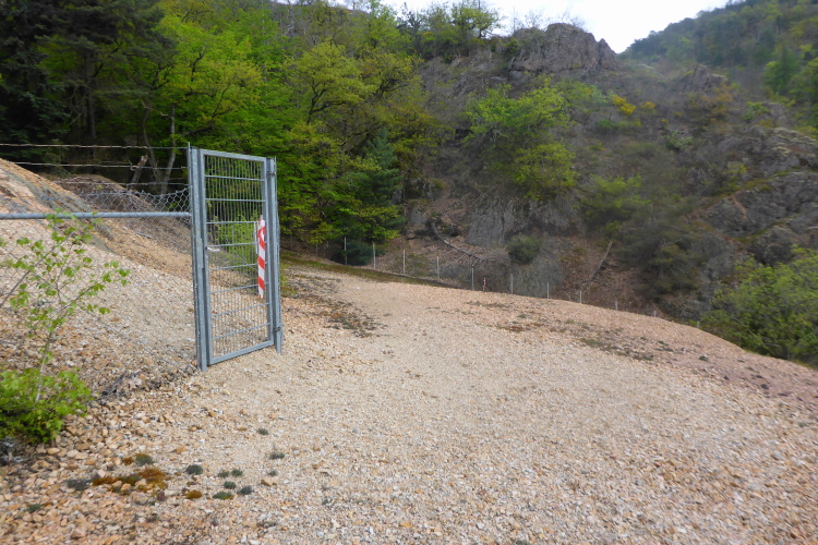 Pfeile weisen auf einen schmalen Pfad den Berg hinauf. Der schöne Trail führt auf eine weite Steinhalde, der Grube Katharina 1. Hier wurde Kupfer, später auch Silber im Tagebau seit dem 9. Jahrhundert abgebaut. Wir laufen am Sperrzaun entlang, und am Ende hinunter, km 12.