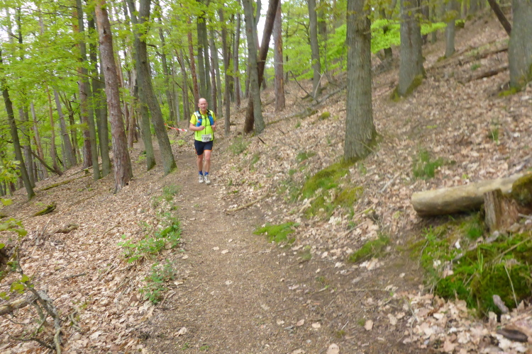 Nach der Engstelle führt ein traumhafter Uphill weiter steil bergauf. Völlig unerwartet werde ich überholt. Der Führende des T23, Marcel Job, steigt geschmeidig an mir vorbei. Ich bin beeindruckt. Beeindruckt bin ich allerdings auch von der Aussicht, die sich oben auf 400 m Höhe bietet: in der Sonne liegen tiefgrüne Wälder unter uns, eine Ortschaft in der Ferne strahlt, eingebettet in gelbe Rapsfelder.