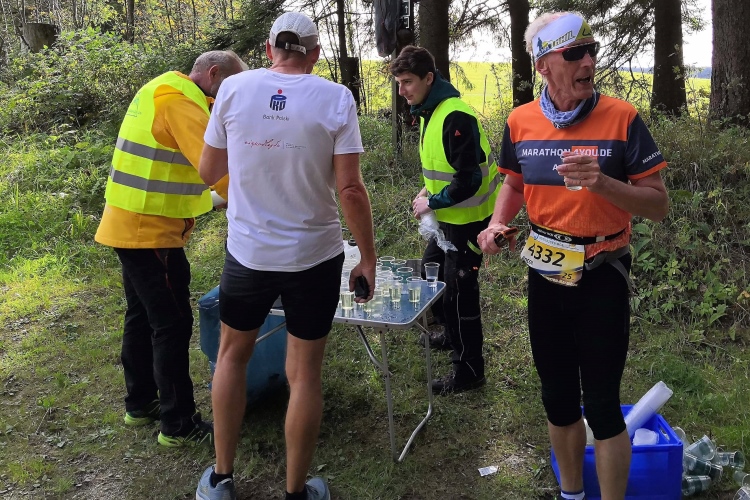 Wir verlassen wieder den Wald und auf dem Parkplatz der Talsperre Sosa können wir erneut verpflegen. Wasser, Tee, Cola, Bananen und was weiß ich noch mehr, warten auf die hungrigen und durstigen Sportler. Auf meine Frage nach dem Erfrischungsgetränk für Bayern meint ein Helfer: „Da musst du die Köhlermusikanten fragen“. Auf meine scharfe Musterung winkt der Trompeter mit einer Flasche Wernesgrüner und schenkt mir den Becher voll. Er will noch wissen, wie viel Kilometer wir schon gelaufen sind. Gut die Hälfte, gebe ich ihm zur Antwort.