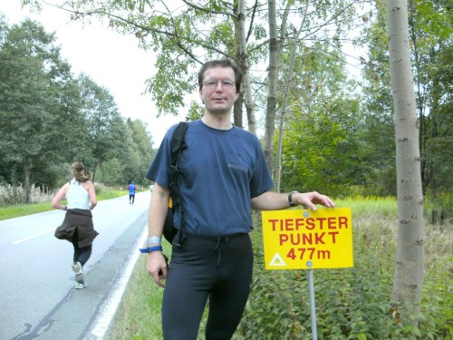 Unterwegs machte ich einen ersten Fotostopp. Hier zeigte sich schon, dass das Fotografieren määächtig aufhält, aber ich blieb immer im Rahmen meines ausgeklügelten Zeitplanes, war also auf keinen Fall zu schnell. Dann überholte mich Marion. Die behauptete doch glatt, die Letzte zu sein (bevor sie mich überholt hatte, versteht sich). Mir war das egal, denn ich hatte meinen Plan. Marion machte auch das Foto von mir am höchsten Punkt der Strecke, bevor sie weit vor mir lief und dann entschwunden war. Naja, bei Kilometer 24 traf ich sie wieder, und von hinten kamen auch noch zwei Läufer. Ich war also zu keinem Zeitpunkt Letzter, nur mal so unter uns.