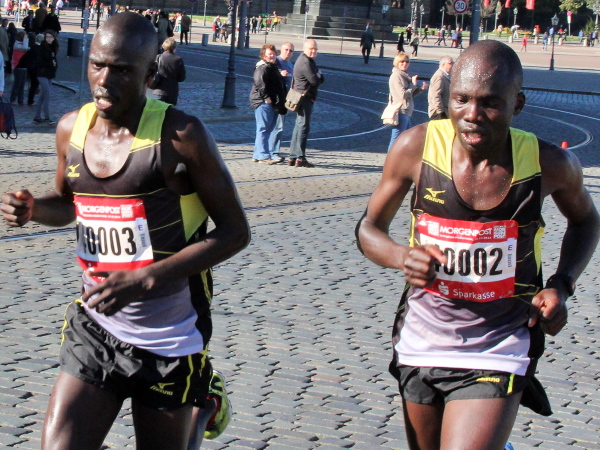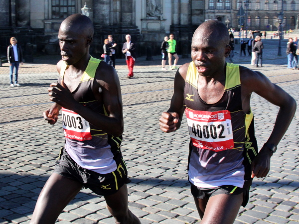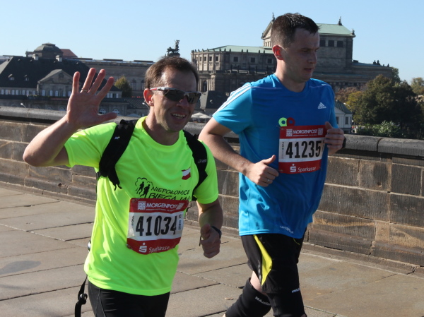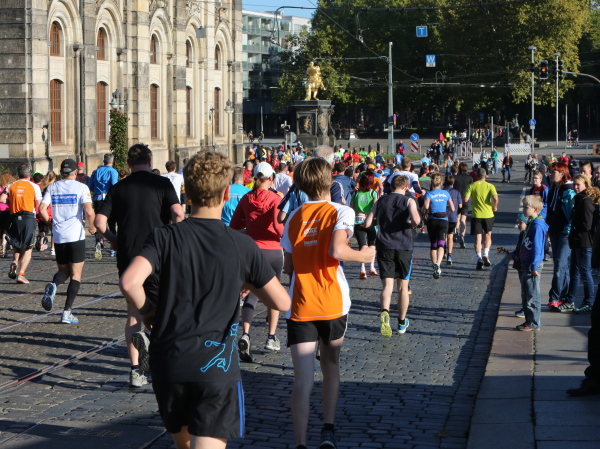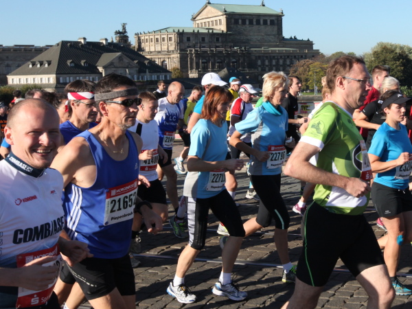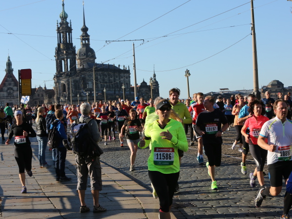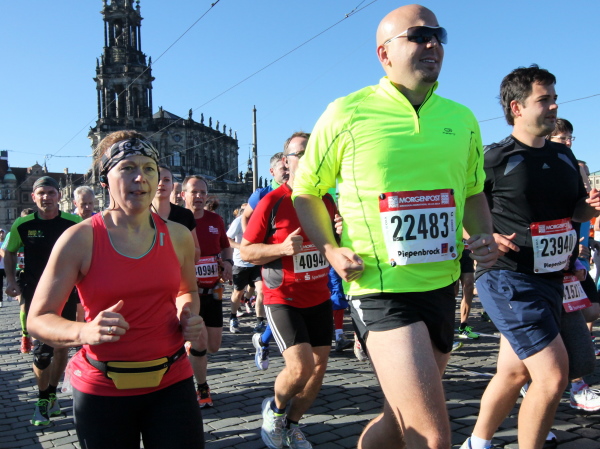 Das Fotografieren hat für mich aber auch etwas gutes, dadurch treffe ich Dieter Fromme. Den Weihnachtsmann, heute ohne sein rotes Ehrenkleid. Wir beschließen gleich mal, gemeinsam die 42 Kilometer hinter uns zu bringen. Und sind uns schon bei Kilometer 1, auf der Augustusbrücke einig: Die neue Streckenführung ist ein Gewinn für die Veranstaltung.