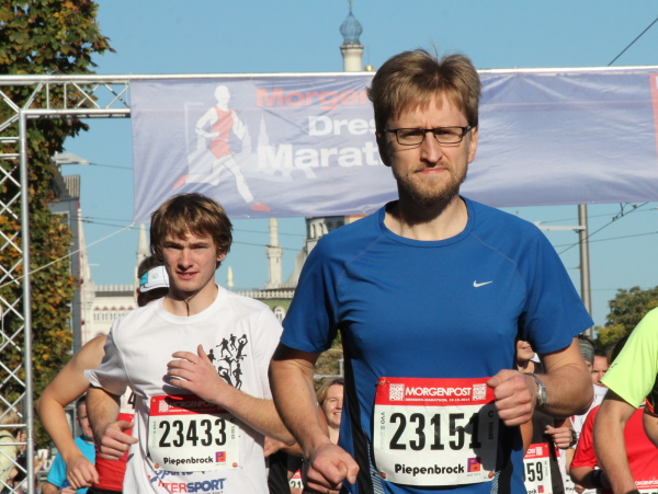 Bis zum Start in der Ostra-Allee sind es nur wenige hundert Meter. Ich bin schon zeitig dort und beobachte, wie 10 Uhr die 10-Kilometer-Läufer auf die Strecke geschickt werden. Als die weg sind, begebe ich mich in den Startbereich. Erst drehe ich darin fast allein Runde um Runde, denn ich habe etwas verloren – meinen Freund Uwe. Das Gehege füllt sich immer mehr, kurz vor dem Start ist meine Bewegungsfreiheit sehr eingeengt und die Hoffnung, Uwe zu finden dahin. Aber so schlimm ist das nicht, der läuft mir ohnehin zu schnell.