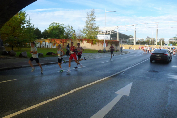 Gegen 09.30 Uhr treffen wir mit der Straßenbahn ein. Nach kurzer Orientierung sehe ich Hinweisschilder, für die Umkleide wird die Tiefgarage des Kongress Centers genutzt, zum Start auf der Pieschener Allee kommt man in fünf bis zehn Minuten Gehzeit. An allen Ecken und Enden ziehen sich die Läufer um, wir treffen Bodo, Jens und Angie. Kurz vor 10.00 Uhr gebe ich meinen Kleidersack ab und mache mich auf den Weg zum Start. Unter der Marienbrücke kommt uns die Spitze des Viertelmarathon-Rennens entgegen.