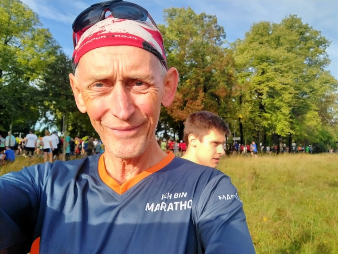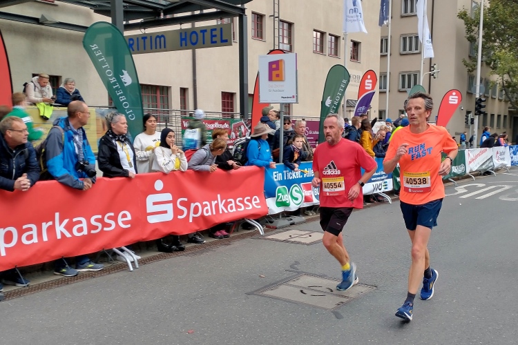 Vor dem Starttransparent weist Norbert die Zeitläufer ein, da bleib ich gerne stehen für einen Fotoschuss. Auf meine Frage, ob er nicht mal mitmachen mag, zeigt mir Norbert einen Vogel. „Du machst deinen Job und ich meinen!“ Zeitläufer stehen für eine Pace von 3.00 Stunden bis 4.30 Stunden zur Verfügung. Mein Plan ist, erst einmal im Tempo für die 4.00 Stunden loszulaufen und dann das Rennen kontrolliert auslaufen lassen.
