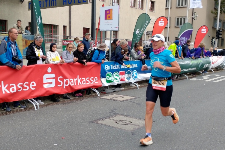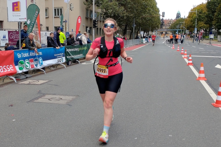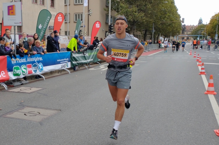 Auf der Striesener Straße sehen wir mit Kilometer 19 schon die markanten Kuppeln der Altstadt, erste Halbmarathonläufer verschärfen leicht ihr Tempo, andere sind am Kämpfen. Beim Brühlschen Garten erreiche ich Kilometer 20 mit Blick auf die Profanbauten am Terrassenufer. Die Zuschauer auf der Augustusbrücke stehen dicht gedrängt und blicken auf uns herab.