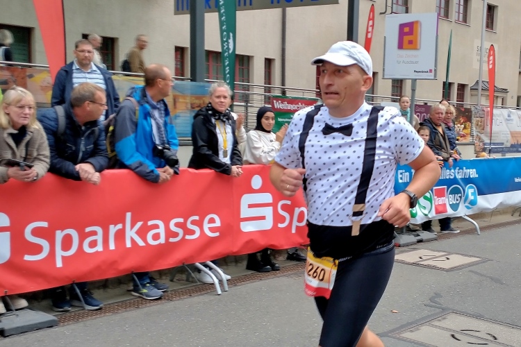 Kurzzeitig laufen wir an der Gläsernen Manufaktur des VW-Konzerns vorbei, eine der drei Produktionsstandorte in Sachsen. 2021 begann hier die Serienproduktion des voll elektrischen ID.3. Über den westlichen Teil der Stübelallee erreichen wir wieder den Begegnungsbereich auf der Fetscherstraße. Ein Läufer spricht mich bei meinem Überholvorgang an: „Was machst du denn hier in Dresden?“, der Peter ist es, Journalist aus Leidenschaft und von Berufswegen.