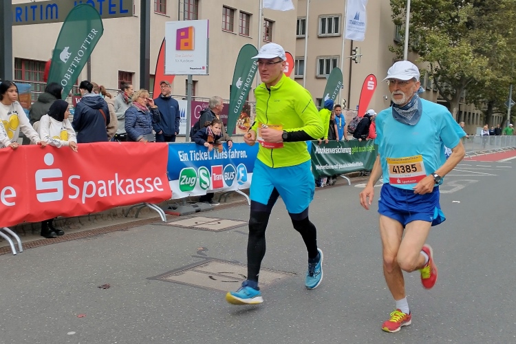 2,5 Kilometer lang geht es nun wieder auf der Fletscherstraße südlich dahin, der musikalische Zuspruch ist ungebrochen, die Musiker sind ausdauernd wie ein Marathoni. Bei dem einen oder anderen Trommler sehe ich Schweißperlen. Zum zweiten Mal erreiche ich das Palais im Großen Garten, so langsam maulen meine Beine. Dein Wunder, Kilometer 35 liegt hinter mir. Jetzt heißt es, die A-Backen zusammenkneifen und weiter, nur keine Gehpause. Bei der Trinkstelle werfe ich ein Gel ein, Zuschauer rufen unsere Namen. Letzte Tränke in der Pillnitzer Straße, ich greife mir einen Becher Cola und laufe weiter.