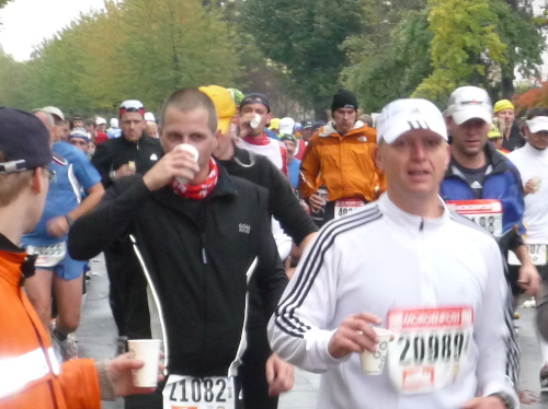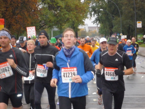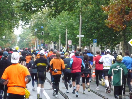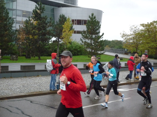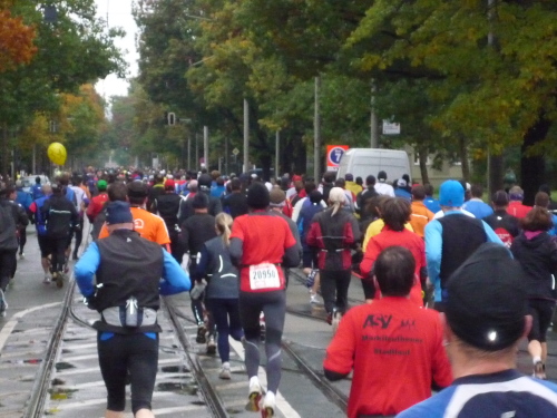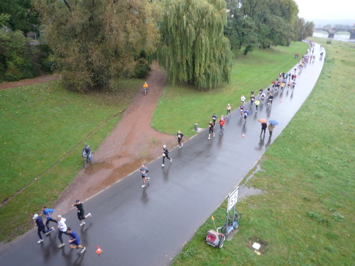 Zwar nicht an, aber nahe der Elbe geht es zunächst noch auf dem Terrassen-Ufer entlang. Kurz vor Kilometer 5 heißt es Abschied zu nehmen von den 10 km-Läufern, die hier abzweigen. Und gleich ist ein wenig mehr Platz auf der Straße. Das Terrassen-Ufer setzt sich über das Käthe-Kollwitz-Ufer weiter elbaufwärts fort, ehe wir bei km 6,5 nach rechts auf die kilometerlange Gerade der Fetscherstraße abbiegen. Diese führt uns mitten hinein in den Stadtteil Johannesstadt. Dichte Laufbäume säumen beiderseits die Straße und es ist besonders schön anzuschauen, wie der Herbst das noch üppige Grün bereits ansatzweise gelb und rot eingefärbt hat.