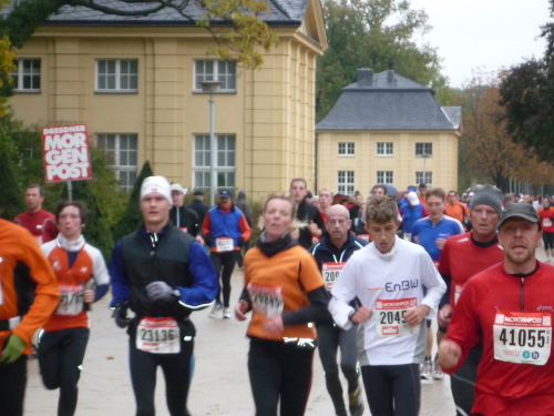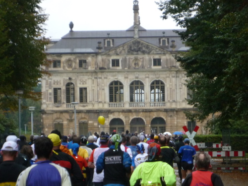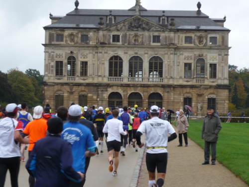 Unser nächstes Etappenziel ist der Große Garten, die mit 180 Hektar größte, bereits im 17. Jahrhundert begründete Parkanlage Dresdens. Die Fletscherstraße stößt direkt auf deren Nordzugang. Doch wir müssen uns in Geduld üben: Denn der Streckenplan sieht vor, dass wir das rechteckige Parkgelände in östlicher Richtung zunächst einmal zur Hälfte umrunden müssen, ehe man uns Zugang gewährt. Und das zieht sich. Bei km 11 ist es soweit. Am Südeingang werden wir eingelassen und steuern von dort direttissma durch dichten Laufwald dem am Horizont schon sichtbaren Palais im Zentrum des Parks entgegen. Gepflegte Rasenflächen und ein hübscher kleiner See umgeben das herrschaftliche Gebäude. Über die Hauptallee werden wir aber gleich schon wieder gen Westen aus dem Park geleitet, um ihn dann außerhalb des Geländes bis zum Nordzugang an der Festscherstraße weiter zu umrunden.