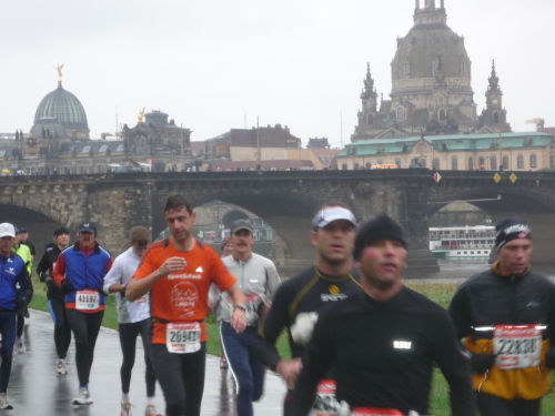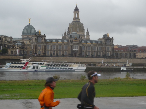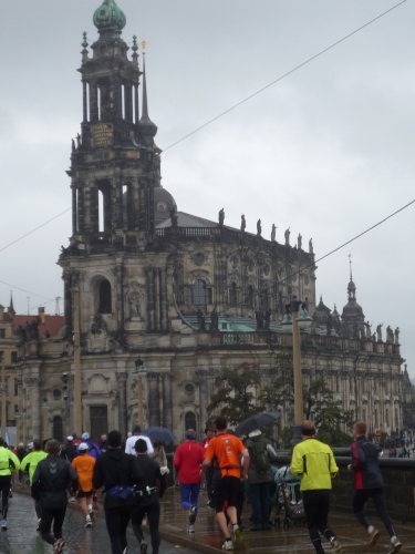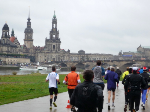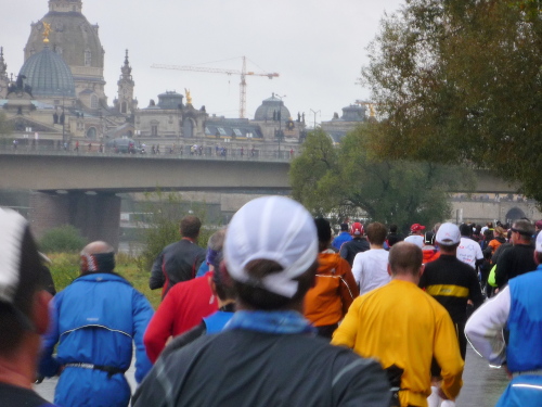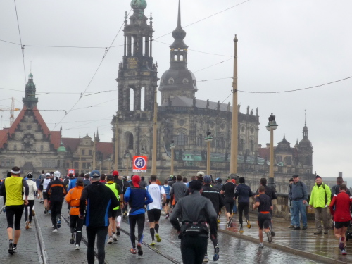 Zurück in der Fetscherstraße folgen wir dieser nun in umgekehrter Richtung. Hierbei stoßen wir jetzt auf regen Gegenverkehr - allerdings nur läuferisch. Es kommen uns auf der anderen Fahrbahnseite all die Läufer entgegen, die den Park noch vor sich haben. Die Fetscherstraße laufen wir jedoch nicht wieder bis zur Elbe ab, sondern zweigen etwa bei km 15 in die Striesener Straße ab, die geradewegs auf die Altstadt zusteuert. Bevor wir, am Horizont die Kuppeln der Altstadt schon sehend, in diese eindringen, werden wir auf die Carolabrücke zur dritten Elbüberquerung geleitet.