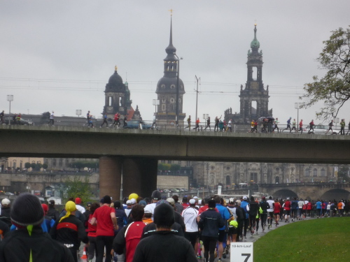 Gerade einmal vier Kilometer liegen hinter uns. Vier Kilometer, die bereits mehr Eindrücke hinterlassen als viele andere Marathons es auf 42 km vermögen. Gar nicht mal so unglücklich bin ich daher, als die Umgebung jenseits der Carolabrücke, der die Altstadt nach Osten begrenzenden Elbbrücke, sagen wir es mal so: optisch "reizarmer" und auch deutlich ruhiger wird.