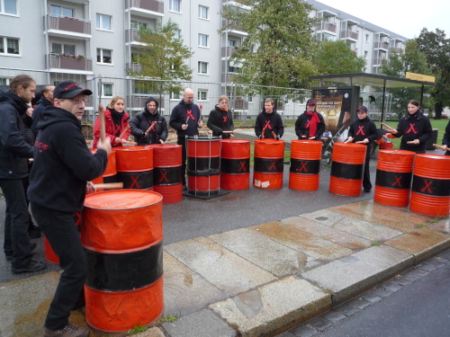 Eher stereotyp ist das Einerlei der umgebenden Siedlungsbebauung. Zu allem Überfluss hat es wieder angefangen zu regnen, was die Tristesse verstärkt. Wie von einem anderen Planeten kommend sticht aus dieser Umgebung die Gläserne Manufaktur heraus. Aus Stahl und vor allem Glas hat VW in die Nordwestecke des Großen Garten die futuristischen Endmontagehallen für seine Luxusfahrzeugmodelle gepflanzt. Seit 2001 läuft hier insbesondere der „Phaeton“ vom Band. Auch wenn der Phaeton sich nicht als das große Verkaufsschlager herausgestellt hat - die Manufaktur bereichert Dresden auf jeden Fall um eine weitere Attraktion. Leider ist hinter der Fassade nicht allzu viel zu erkennen. Beeindruckend ist der Komplex aber selbst im Vorbeilaufen allemal.