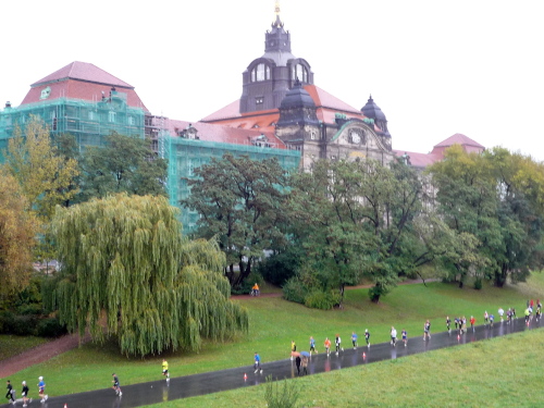 Erstmals müssen wir uns ein Streckenstück mit dem Autoverkehr teilen, aber der für die Läufer abgesperrte Straßenteil lässt genug Platz für einen ungestörten Lauf. Auf der anderen Elbseite thront hoch über dem Elbufer in Traumlage und von ausladenden Weiden umgeben der repräsentative Gebäudekoloss der Staatskanzlei, Sitz des sächsischen Ministerpräsidenten und diverser Ministerien. Anfang des letzten Jahrhunderts entstand er, um Platz für den aufgeblähten Verwaltungsapparat zu schaffen. Böse Zungen werden behaupten, dass sich daran bis heute nichts geändert hat.