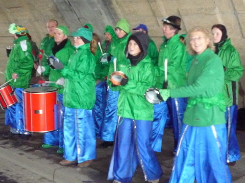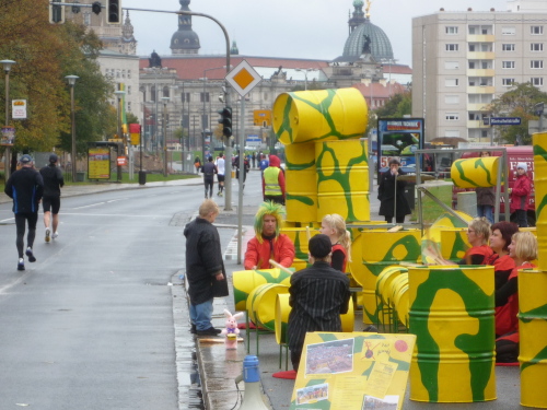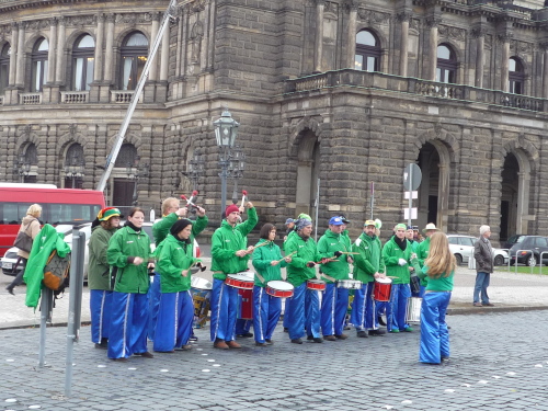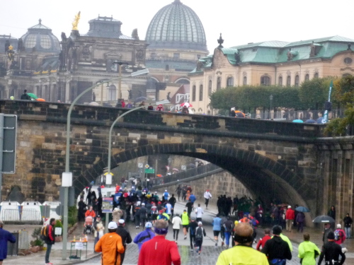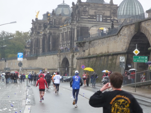 Vor der Semperoper heizt eine große Trommlergruppe uns und den Zuschauern ein. Womit ich bei einem ganz besonderen Charakteristikum des Dresden Marathon wäre. Wollte man diesen musikalisch einordnen, so wäre er ganz eindeutig als der „Drummer-Marathon“ schlechthin zu bezeichnen. Noch keinen Marathon habe ich mit derart vielen Trommel- und Rhythmusgruppen erlebt. Farbenfroh in rot, gelb, grün, blau gewandet lauern sie an allen möglichen Stellen entlang der Strecke, vor allem im Innenstadtbereich, aber auch dort, wo sich keine Zuschauer hin verirren, und heizen der Kälte und der feuchten Witterung zum Trotz unermüdlich und weithin hörbar dem Laufvolk ein. Vor allem unter den Brücken ist die Akustik geradezu phänomenal. Nicht unterschlagen will ich, dass es auch anderes im musikalischen Angebot gibt, aber eben nur ausnahmsweise, etwa Rockiges vor dem Zugang zum Großen Garten und Volksmusikalisches in den Elbwiesen. An dieser Stelle jedenfalls ein herzliches Dankeschön an die vielen unbekannten Musiker für ihre tolle mentale Unterstützung.