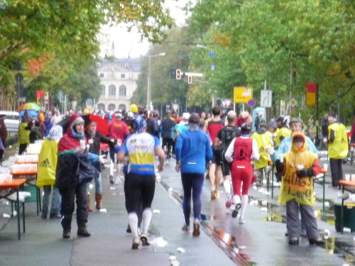 Mehr als auf der ersten Runde bestimmen die Versorgungsstationen meinen Lauf. Ich nehme sie sehr viel intensiver in Anspruch und lasse mir auch mehr Zeit. Wie die Organisation im Übrigen ist auch die Verpflegung an der Strecke vorbildlich. Versorgungsstationen mit „vollem Programm“, d.h. mit Wasser, Isogetränken, zum Teil auch warmem (!) Tee - bei den kühlen Temperaturen einfach ideal - und Cola, sowie Bananen, Energy-Riegeln und Rosinenbrot sind etwa alle fünf Kilometer eingerichtet. Dazu kommen noch einige Stationen, die ausschließlich Wasser anbieten. Soweit möglich sind die vielen Verpflegungstische beidseits der Straße postiert, sodass sich auch auf der ersten Runde nur wenig Behinderungen ergaben. Auf der zweiten Runde sind oft mehr Helfer als Läufer an den Tischen zu sehen. Schilder zeigen an, was es jeweils gibt, und eine engagierte Helferschar steht ohnehin bereit, die Becher den Läufen entgegen zu reichen. Welche Abfallberge das allerdings hinterlässt, kann ich insbesondere jetzt auf der zweiten Runde bestaunen.