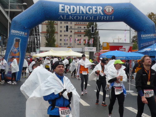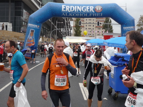 Mit Gittern sind die letzten hundert Meter Wegstrecke abgesperrt. Noch einmal dichte Zuschauerreihen erwarten händeklatschend die Ankömmlinge. Von einem Zielmoderator wird jeder der Einlaufenden persönlich begrüßt und in meinem Fall schon mal ein Bericht in marathon4you angekündigt. Erschöpft, aber in bester Stimmung durchlaufe ich den großen blauen Zielbogen. Hinter der Ziellinie werden Wärmefolien und Medaillen traditionell von einer Gruppe Vietnamesen ausgegeben. Ich stürze mich jedoch als erstes auf ein kühles Bierchen von Sponsor Erdinger und verzichte auf sonstige Angebote der Zielverpflegung. Für mich gibt es einfach keine schönere Belohnung als ein “zischendes” Bier nach einem langen, schweißtreibenden Lauf - aber das liegt vielleicht auch an meinen bayerischen Genen.