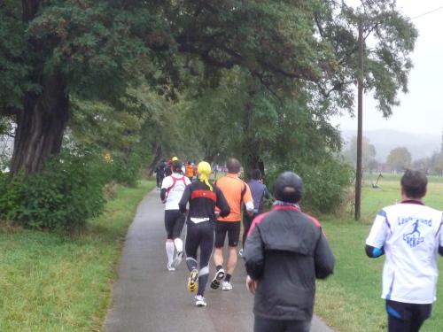 Das ändert sich aber nicht weit hinter der Carolabrücke. Hier werden die Marathonis „exklusiv“ auf einen deutlich schmaleren Asphaltweg gelotst, der uns am Fluss entlang durch die Weite der Elbwiesen führt. Ein sehr stimmungsvolles Teilstück liegt vor uns. Die friedliche Natur, die Ruhe, die diesige Luft und der Nieselregen - das hat durchaus seinen ganz eigenen Reiz, auch wenn das Elbpanorama bei Sonnenschein natürlich noch etwas mehr Charme hätte. Leider währt dieses Wegstück nur etwa 1,5 km und wir kehren zurück auf die normale Straße, das Käthe Kollwitz-Ufer.