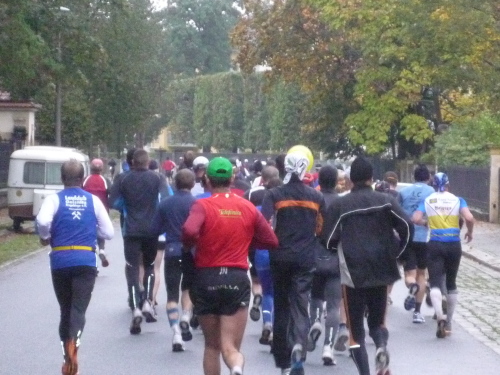 An der Kreuzung zur Fetscherstraße werden wir nicht in diese abgeleitet, sondern setzen unseren Weg entlang der Elbe gen Osten fort. Erneut begegnet uns läuferischer Gegenverkehr und wir können einen Blick auf die vereinzelt daher tröpfelnden „Spitzenläufer“ werfen, wobei dieser Begriff hier nur relativ zu verstehen ist. Ganz bewusst hat der Veranstalter auf Antrittsgelder und „Alibi-Afrikaner“ zum Schönen der Statistik verzichtet und ganz auf den Breitensport gesetzt. Eine begrüßenswerte Entscheidung. Auch wenn Dresden damit in der Zeiten-Vergleichsstatistik keine Top-Zeiten vorweisen kann, so sei denen, die die Strecke nicht kennen, gesagt: Die Dresdener Marathonstrecke ist sehr flach, hat vergleichsweise wenig Kurven und ist damit in besonderer Weise zum Erzielen einer persönlichen Bestzeit geeignet.