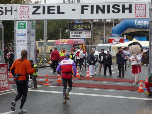 Eine knappe Stunde vor mir hat bereits der Sieger die Ziellinie überquert. Lokalmatator Paul Schmidt aus Dresden hatte mit 2:32:43 die Nase vorn. Den deutschen Dreifachtriumph bei den Männern - ein eher seltenes Ereignis in der Marathonszene - machen Karsten Kühn und Kay Weber mit 2:33:24 bzw. 2:34:06 perfekt.