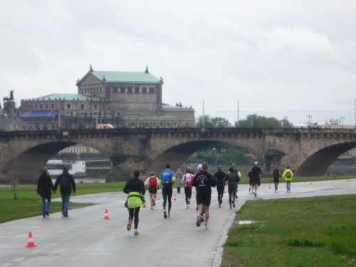 Die zweite Runde entspricht weitgehend der ersten, aber eben nicht ganz. Es fehlen die ersten drei Kilometer der ersten Runde. Diese werden dafür an anderer Stelle angestückelt. Aber der Reihe nach. Vom Theaterplatz aus geht es über das Terrassenufer an der Elbe entlang wieder flussaufwärts. Dass an der Semperoper mehr als zwei Drittel der Läufer aus dem Feld heraus gefallen sind, merkt man sehr deutlich. Ungewohnt viel Platz ist auf der breiten Straße.