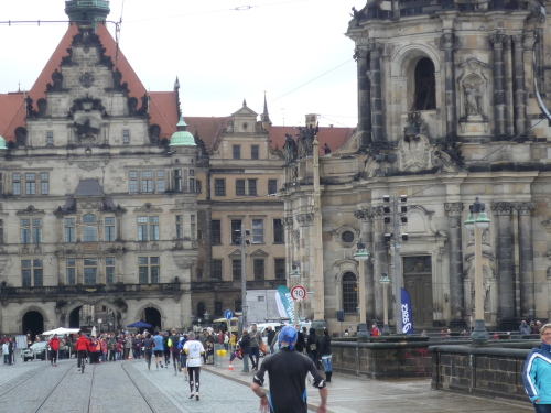 Nach der Rundtour um und durch den Großen Garten geht es wie gehabt wieder in Richtung Innenstadt, über die Carolabrücke hinab auf die Elbwiesen und sodann zum nunmehr dritten Mal über die Augustusbrücke in die Altstadt. Die Läuferschar ist jetzt schon sehr weit auseinander gezogen. Auch der Zuschauerandrang auf dem Schloss- und dem Theaterplatz hat deutlich nachgelassen, was aber auch kein Wunder ist - die Masse der Halbmarathonis ist im Ziel und jetzt laufen nur noch die Marathon-„Exoten“ durch die Stadt. Unverdrossen und mit unverändertem Eifer sind allerdings die Trommler-Gruppen zu Gange. Bei der Semper-Oper sind wir dem Ziel schon ganz nahe. Ein Stückchen müssen wir noch der Elbe folgen, dann geht es vorbei am modernen, aber vergleichsweise unauffälligen Bau des Sächsischen Landtags und schon sehe ich gar nicht mehr fern das ICC.