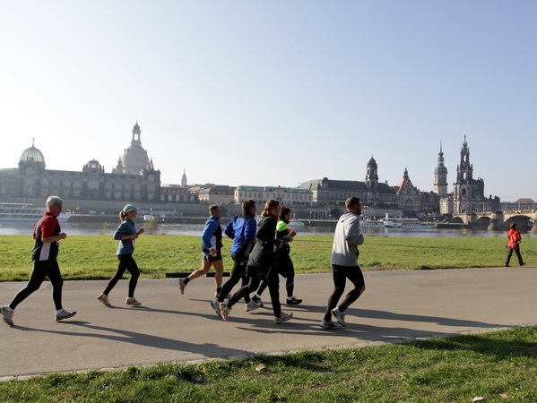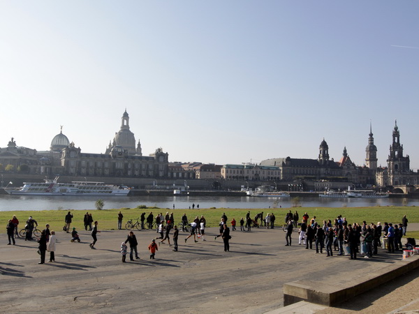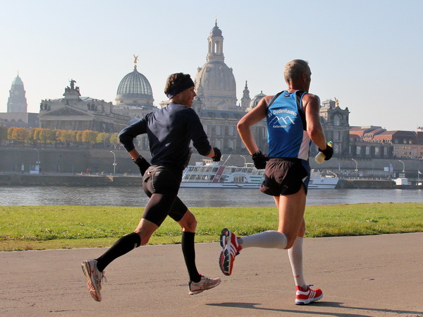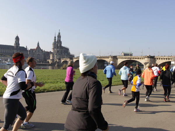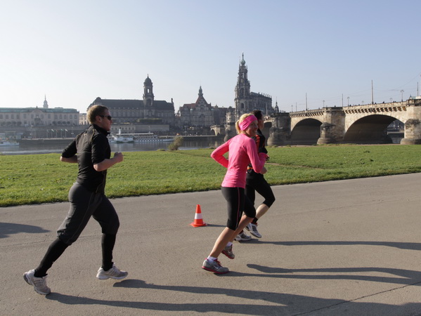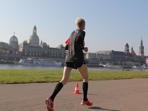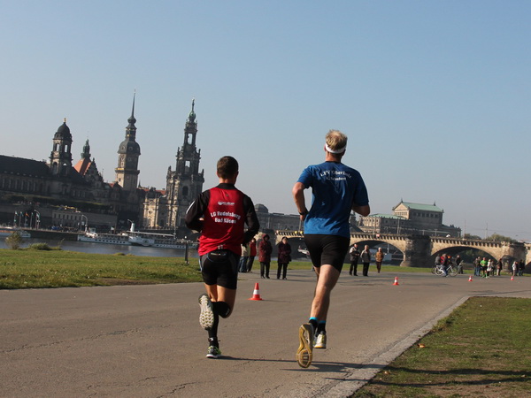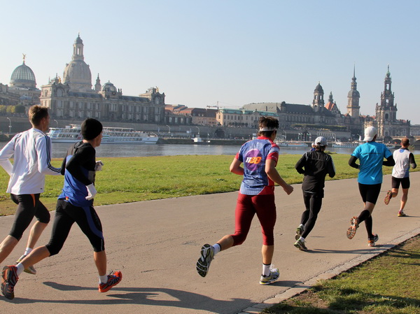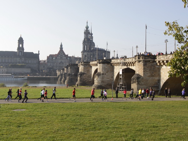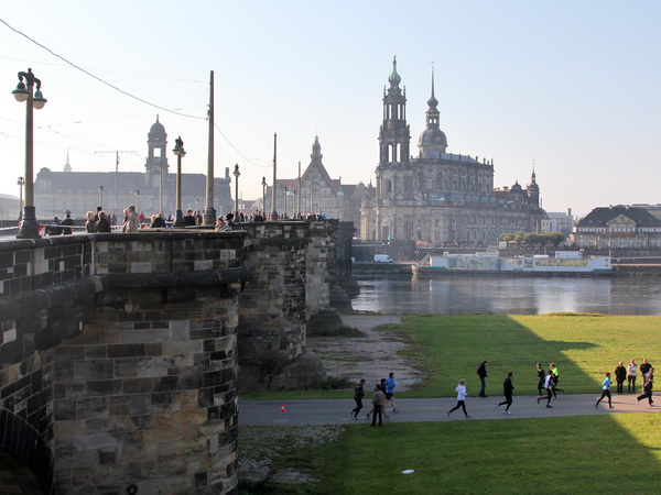 Da trifft es sich gut, dass unser Läufchen nun auf das Terrassenufer leicht gefällig vonstatten geht. Wir unterqueren die Augustusbrücke. Kurz danach sehen wir rechterhand oberhalb die Brühlschen Terrassen, die als ein Teil der Befestigungsanlage im 16. Jahrhundert erbaut wurden. Auf dem rund 500 Meter langen Bauwerk, das zehn Meter über unserer Laufstrecke steht, ist die Aussicht auf die Elbe und das gegenüberliegende Neustadt einzigartig.