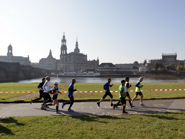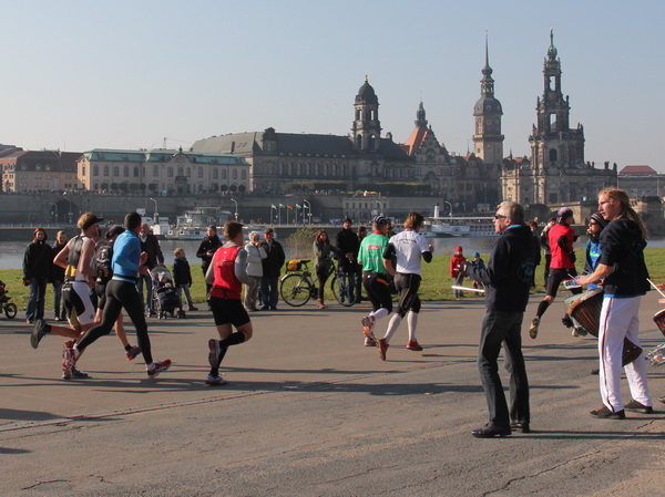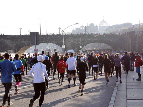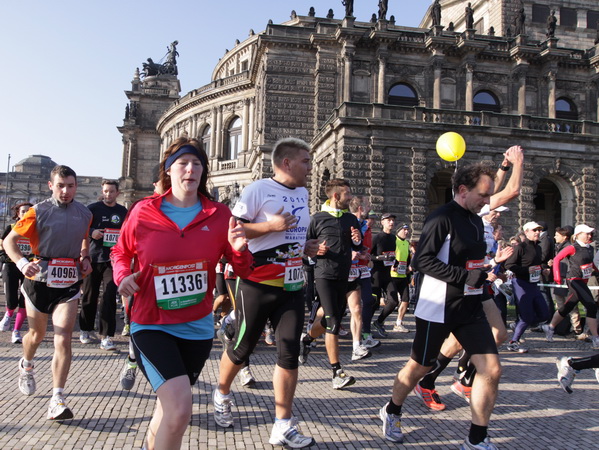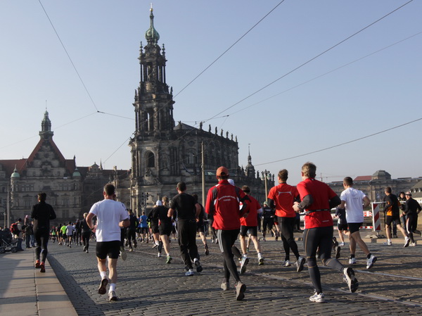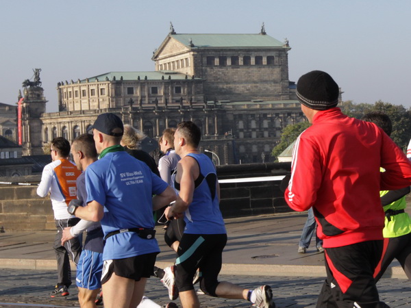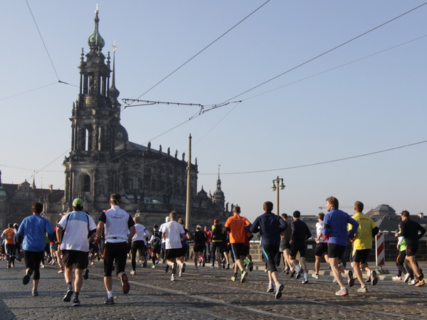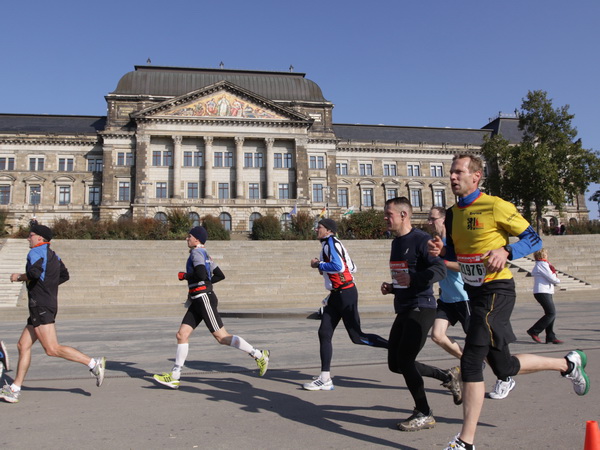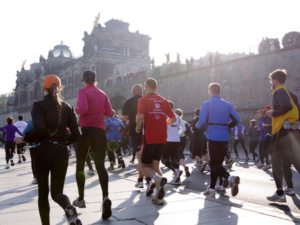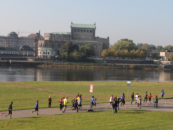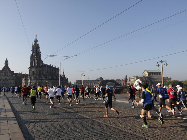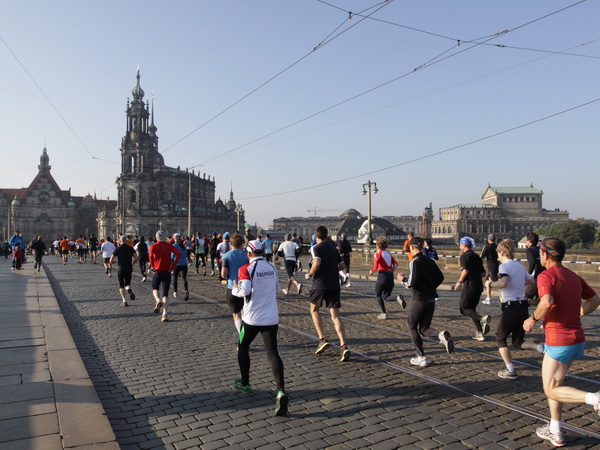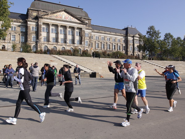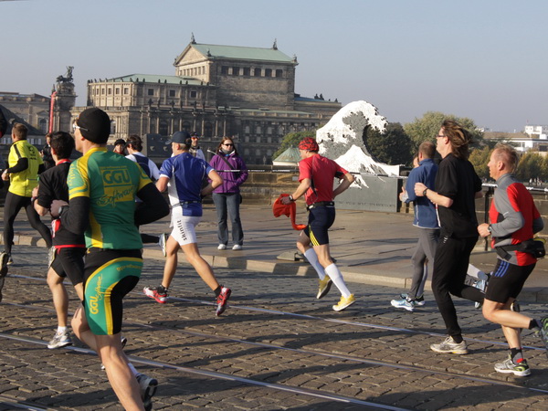 Wir rollen auf der Ostra Allee gut dahin, das Yenidze im Blickfeld. Früher war es eine Produktionsstätte für Tabakwaren, heute werden unter der Kuppel kulturelle Veranstaltungen abgehalten. Auffällig ist der moscheeartige Baustil. Wenige Läufer sind wie scharrende nervöse Pferde. Da wird ohne großes Federlesens im Feld gequert oder von hinten herangespurtet. Dabei gibt es noch genügend Gelegenheiten sich voranzuarbeiten. Von dem Risiko, sich selbst oder jemand anders zu Fall zu bringen, ganz zu schweigen.