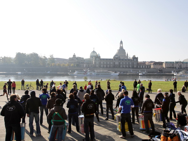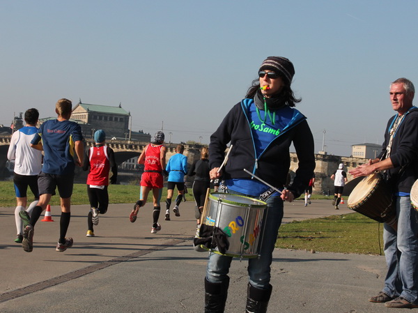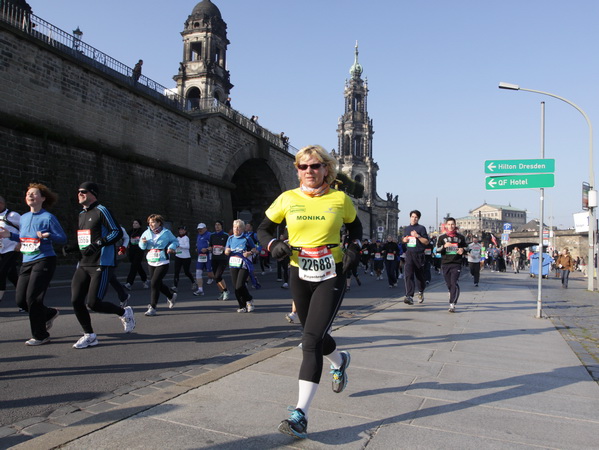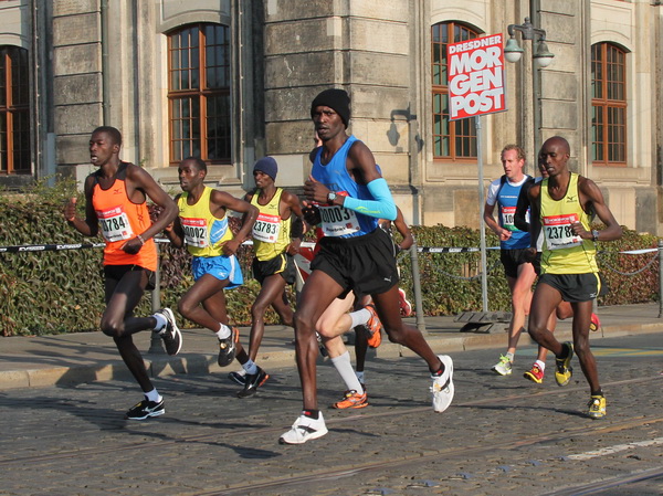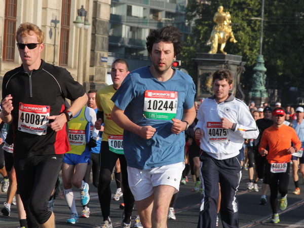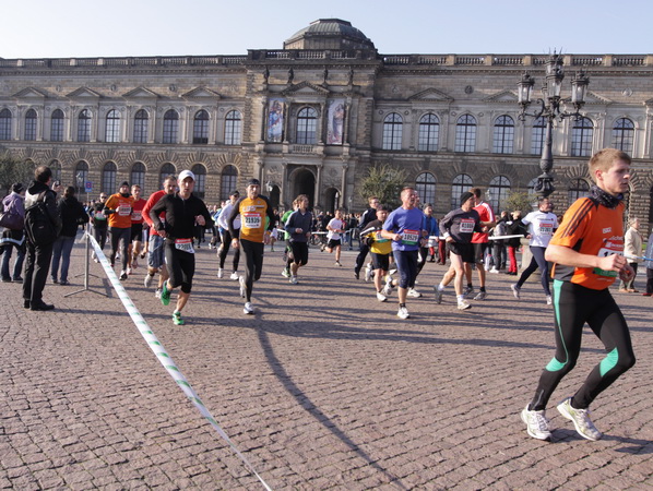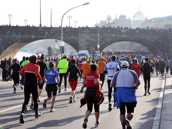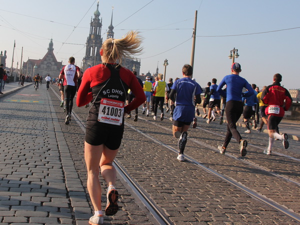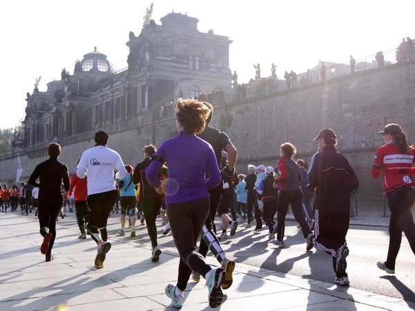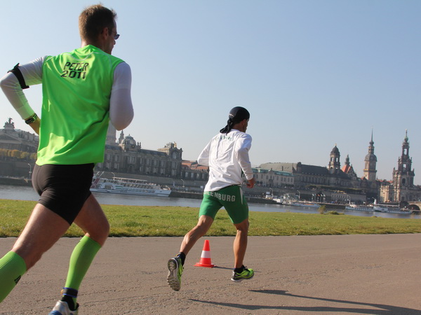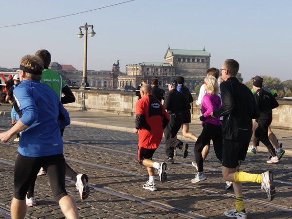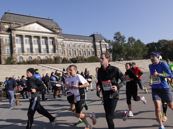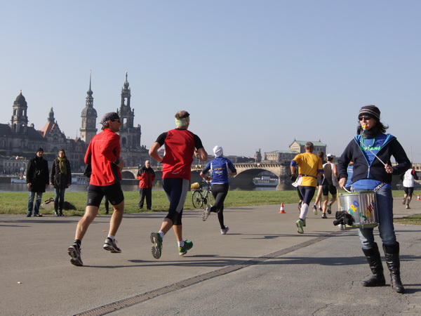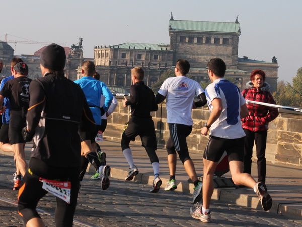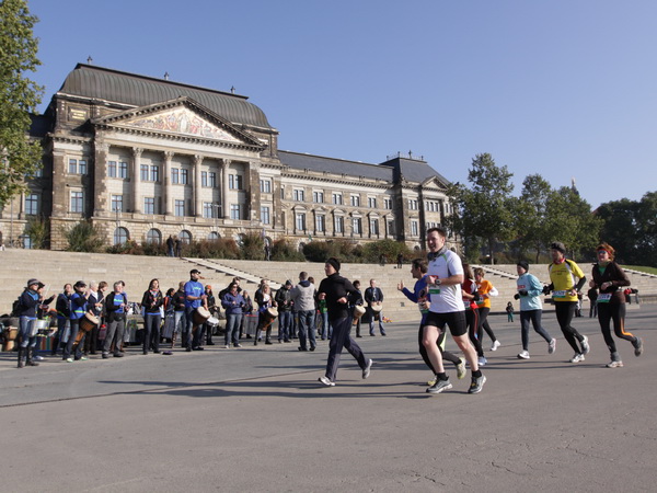 Wir rollen auf der Ostra Allee gut dahin, das Yenidze im Blickfeld. Früher war es eine Produktionsstätte für Tabakwaren, heute werden unter der Kuppel kulturelle Veranstaltungen abgehalten. Auffällig ist der moscheeartige Baustil. Wenige Läufer sind wie scharrende nervöse Pferde. Da wird ohne großes Federlesens im Feld gequert oder von hinten herangespurtet. Dabei gibt es noch genügend Gelegenheiten sich voranzuarbeiten. Von dem Risiko, sich selbst oder jemand anders zu Fall zu bringen, ganz zu schweigen.
