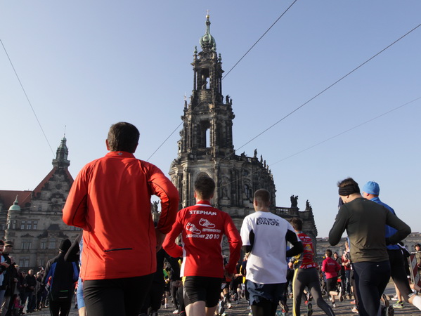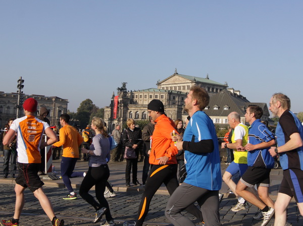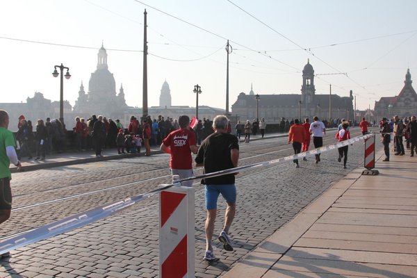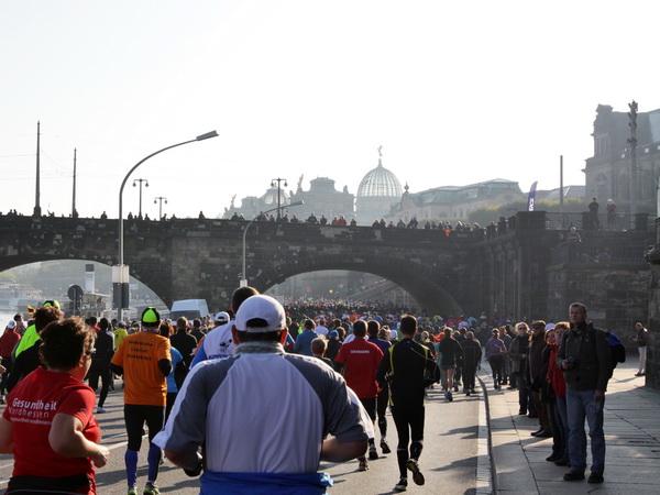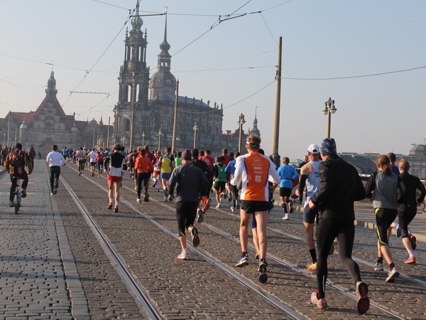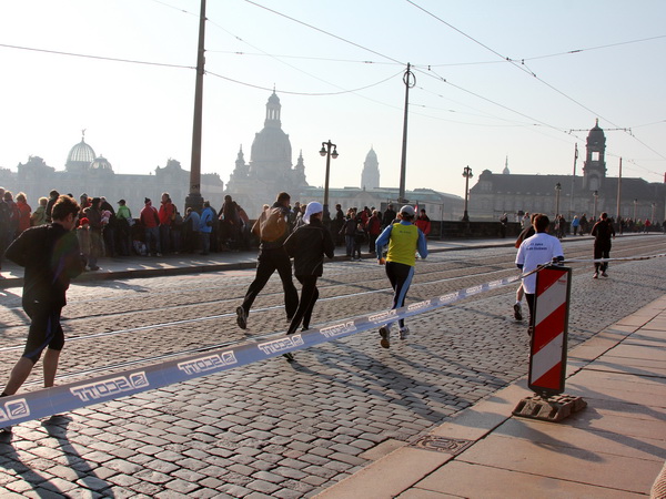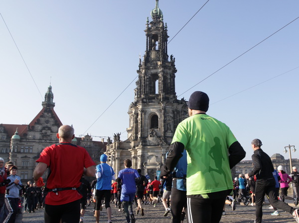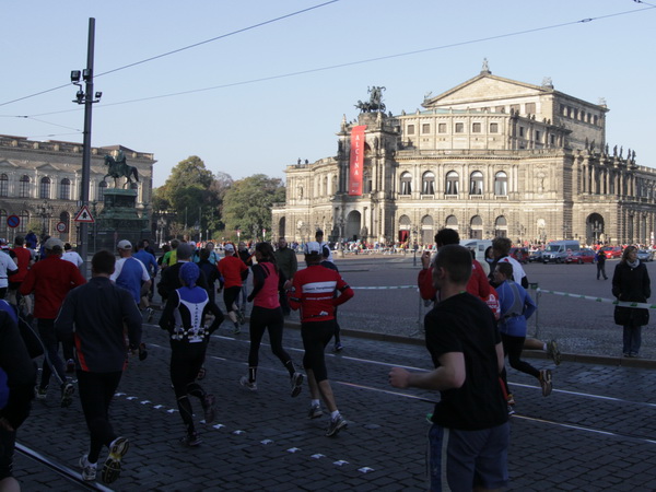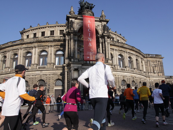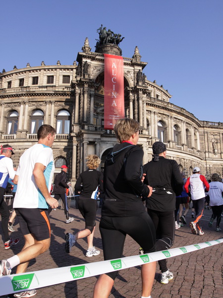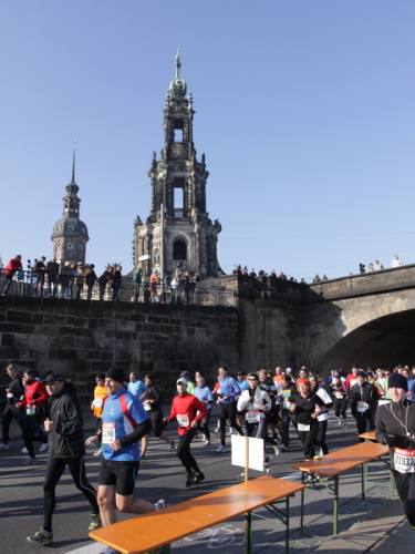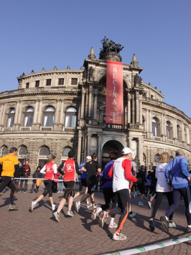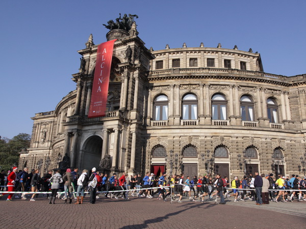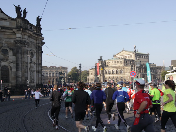 Eine große Zuschauermenge erwartet uns. Jochen Heringhaus kündigt die Läufer am laufenden Band namentlich an. Und ohne Unterlass kann ich die Sehenswürdigkeiten aufzählen. Hofkirche, Ständehaus und Georgstor, letzteres wurde als Motiv der diesjährigen Medaille gewählt. Um den verkürzten Zielauflauf auszugleichen, ist eine kleine Schleife vor dem Zwinger eingebaut.