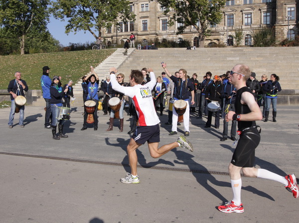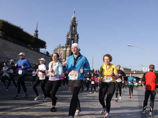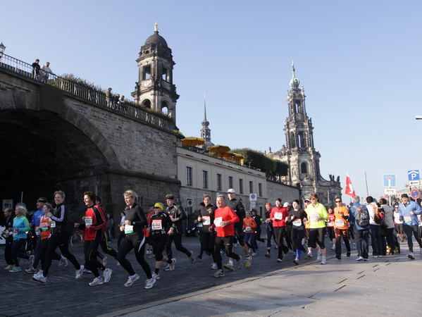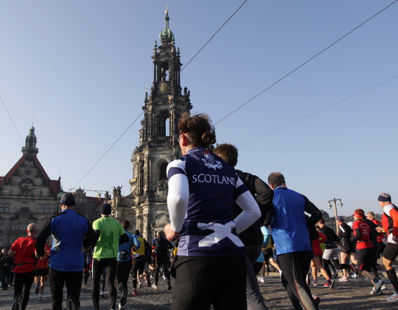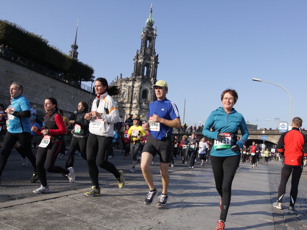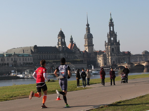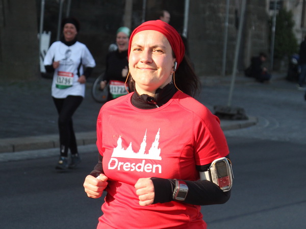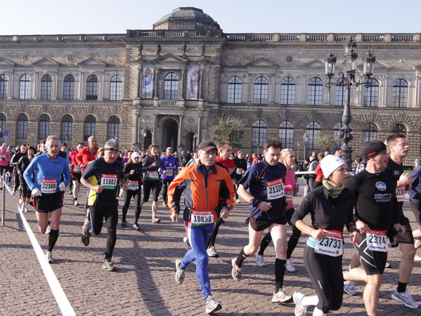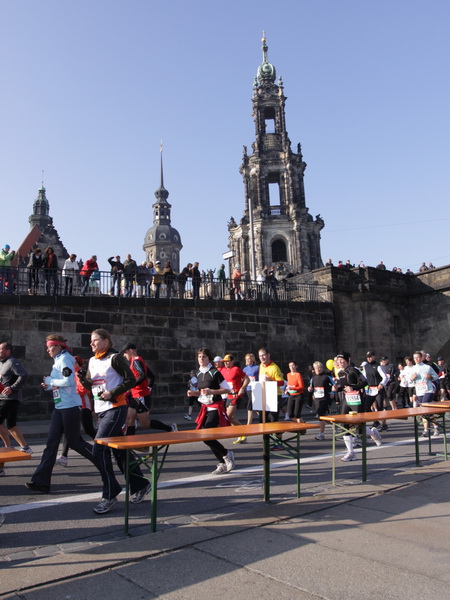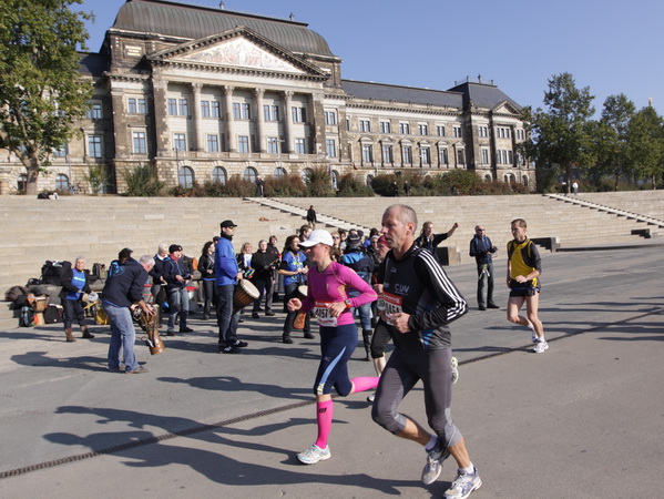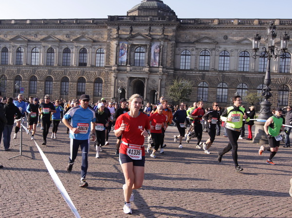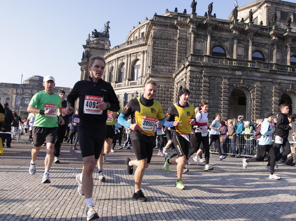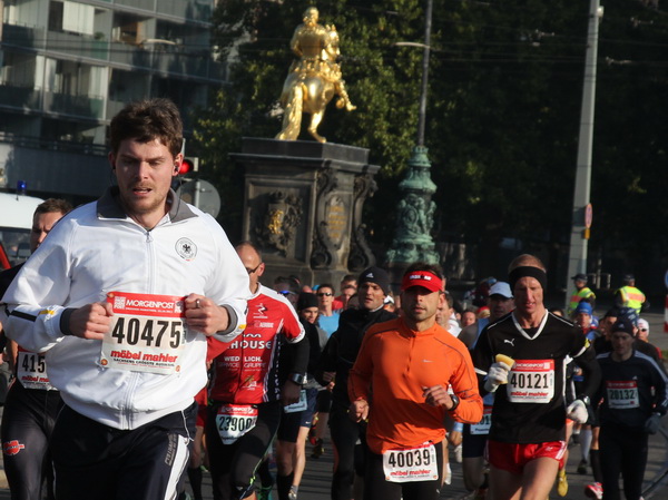 Eine große Zuschauermenge erwartet uns. Jochen Heringhaus kündigt die Läufer am laufenden Band namentlich an. Und ohne Unterlass kann ich die Sehenswürdigkeiten aufzählen. Hofkirche, Ständehaus und Georgstor, letzteres wurde als Motiv der diesjährigen Medaille gewählt. Um den verkürzten Zielauflauf auszugleichen, ist eine kleine Schleife vor dem Zwinger eingebaut.