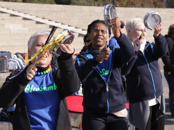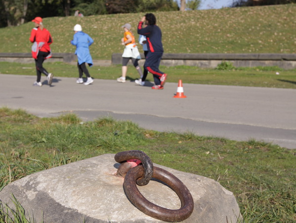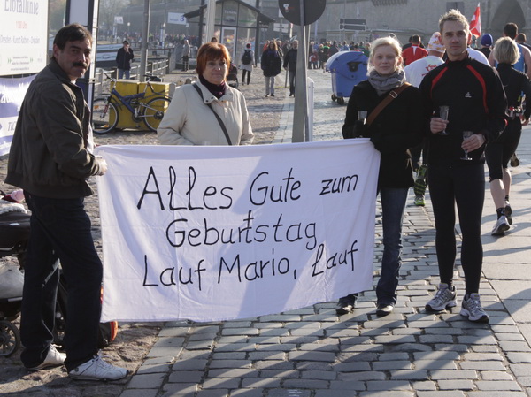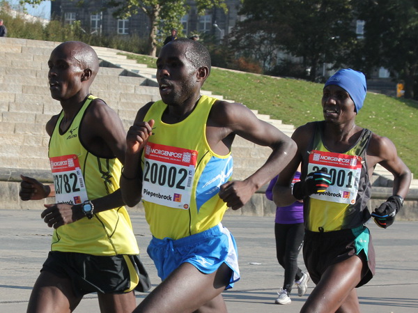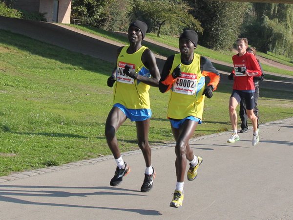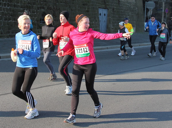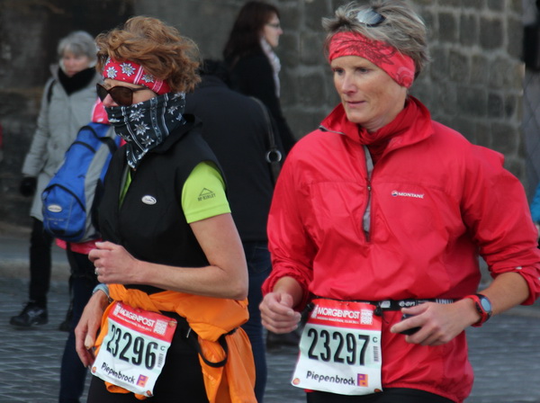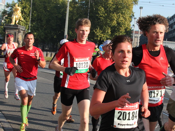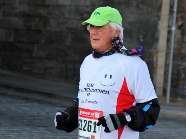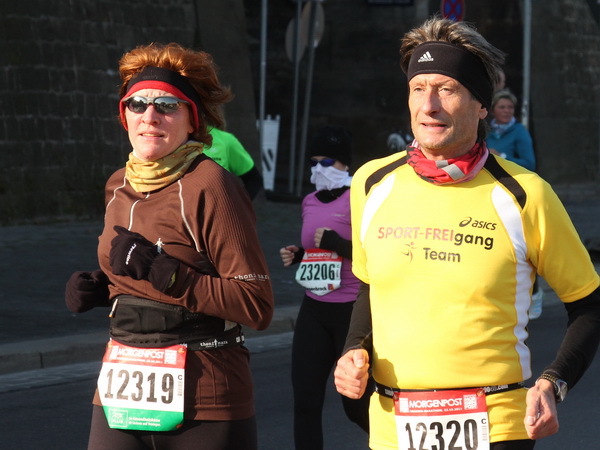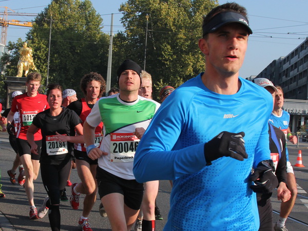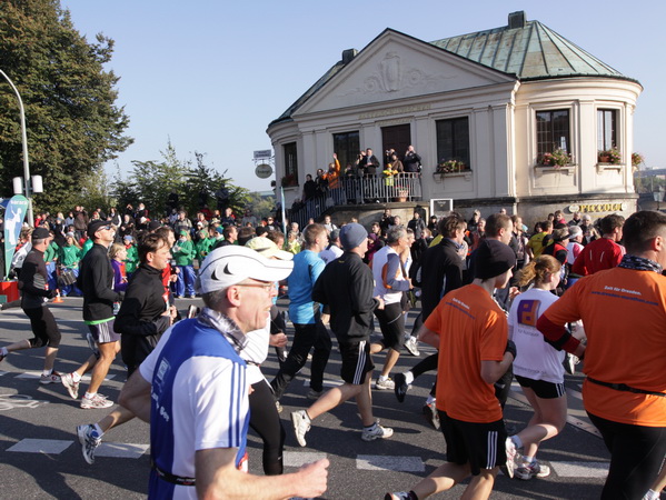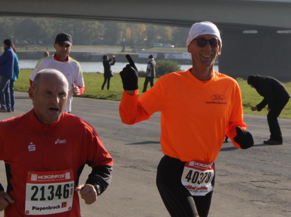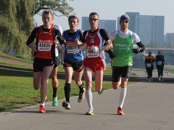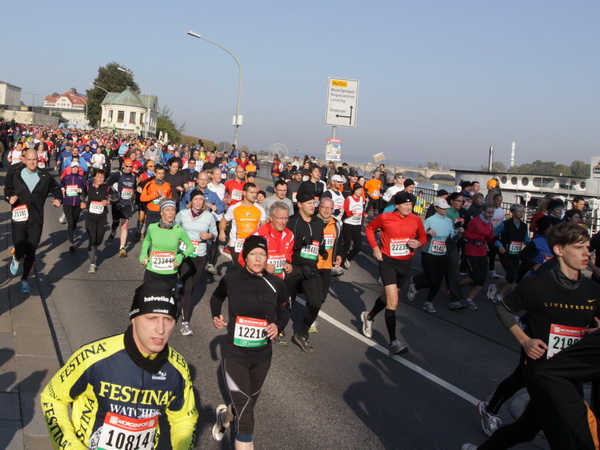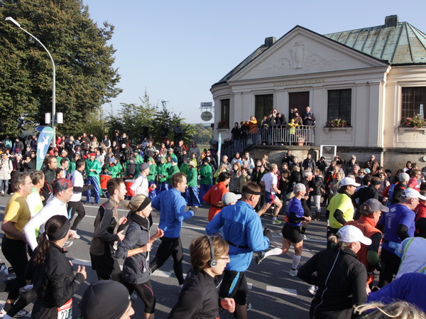 Nach weiteren knapp zwei Kilometern auf dem Käthe-Kollwitz-Ufer hat sich die leichte Unruhe im Läuferfeld gelegt. Wir finden Platz zum Überholen und zur Unterhaltung, wobei letzteres im Bereich der 3-Stunden-Läufer eher die Ausnahme ist.