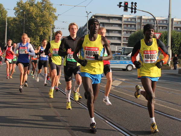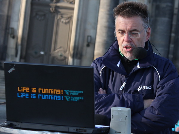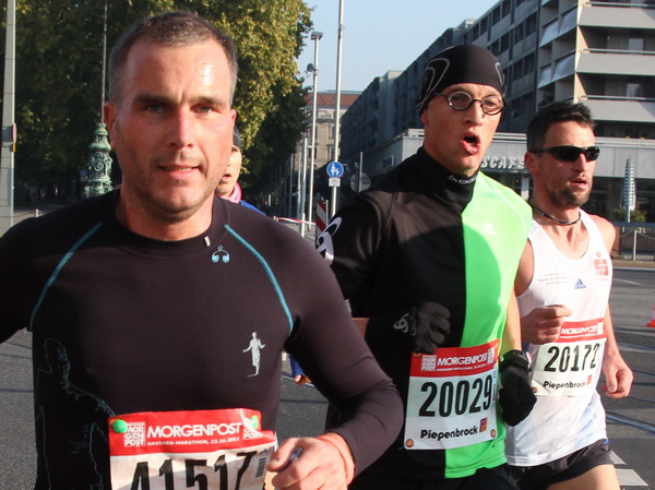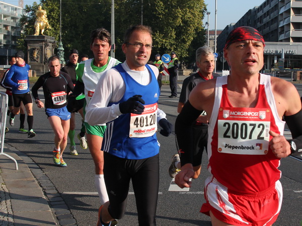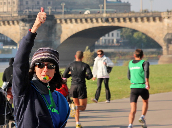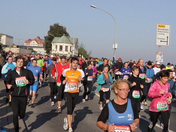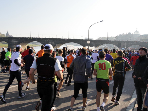 Etwa 500 Meter entfernt vom ICC finden wir das Startgelände auf der Ostra Allee. Die Kinder und Jugendlichen des Mini-Marathons über 4,2 Kilometer sind gerade gestartet und machen sich auf ihre Runde nach Neustadt auf den Weg. Die Zuschauer und Läufer werden hier bereits vom bekannten Moderator Artur Schmidt eingestimmt. Wer kennt den sympathischen Sprecher nicht, der ein wandelndes Lexikon in Sachen Leichtathletik ist. Die Spitzenläufer und die Zeitläufer werden vorgestellt. Leider hat der Pacer für die drei Stunden abgesagt. Zu gerne hätte ich mich da am Anfang dahinter geklemmt.