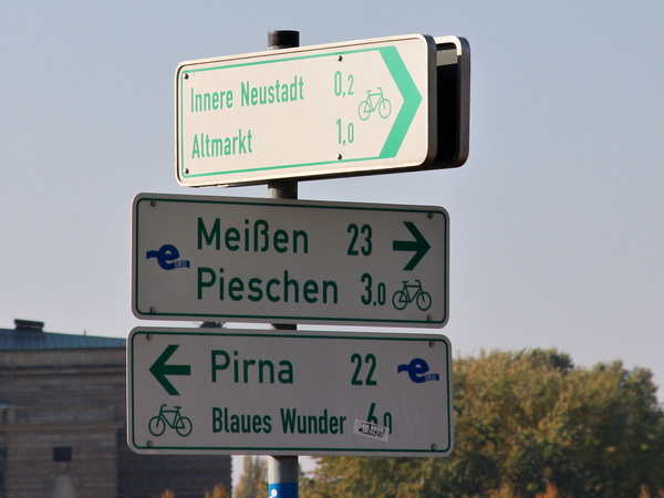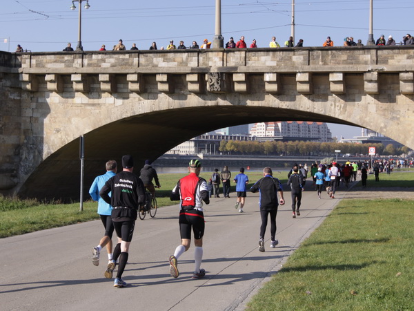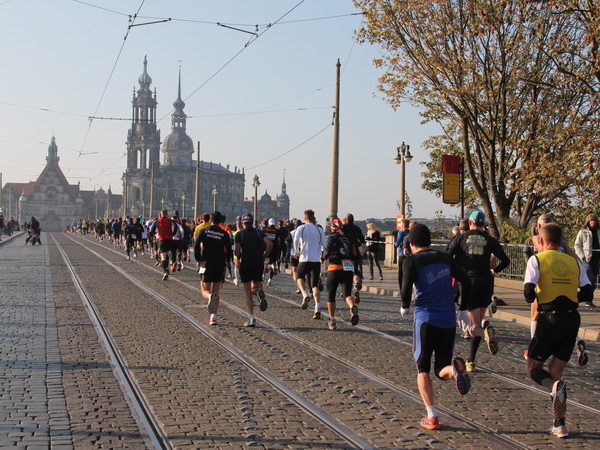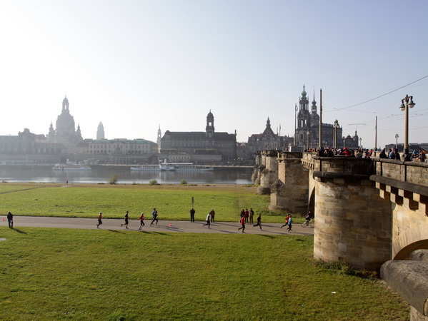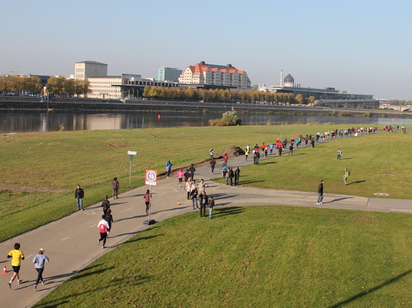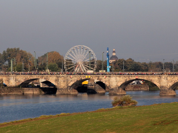 Am Ende der Ostra Allee geht der Kurs rechts ab und im Breitkeil laufen wir auf die Rampe der Marienbrücke zu. Mit dem Namen werden eigentlich zwei unabhängige Bauwerke bezeichnet. Während die Straßenverbindung seit 1852 besteht (damals auch noch mit dem Eisenbahnverkehr kombiniert), wurde die westlich gelegene Eisenbahnbrücke zu Beginn des 20. Jahrhunderts in Betrieb genommen. Aufpassen, denn beim Überqueren der Brücke kriegst du beim Schauen nach rechts fast einen langen Hals: Das einzigartige Panorama der Barockbauten von Elbflorenz bei diesem goldenen Oktobersonnenschein, einfach prima. An der Nordseite der Brücke liegt der erste Kilometerabschnitt schon hinter uns.