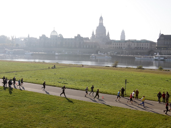 Nach der Carolabrücke wird es für das Auge ruhiger, denn die optischen Reize werden deutlich weniger. Aber es wird nicht langweilig. Am Ende des Terrassenufers (Kilometer 4,5) folgt die erste Streckentrennung. Schilder und Lautsprecheransagen weisen darauf hin. Die Zehn-Kilometer-Läufer biegen rechts ab.