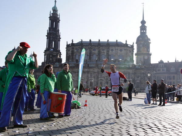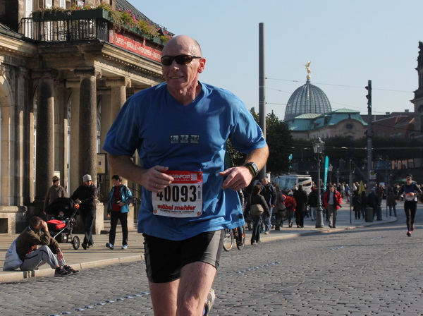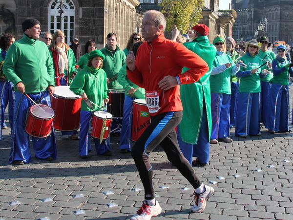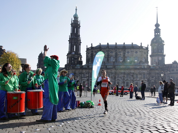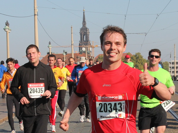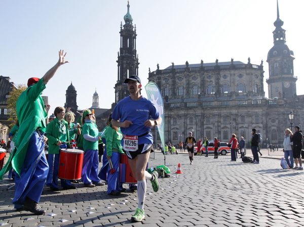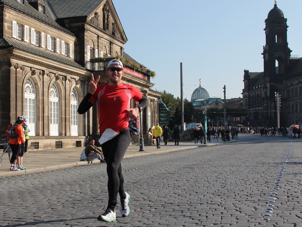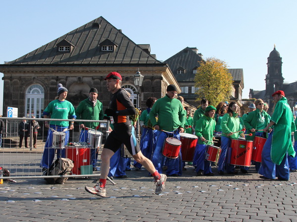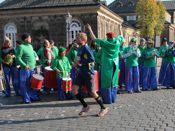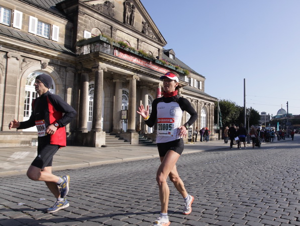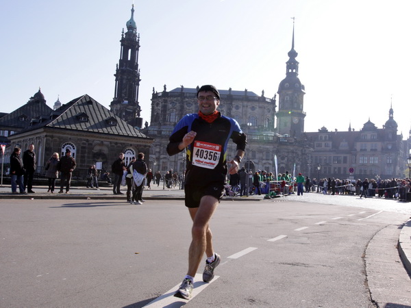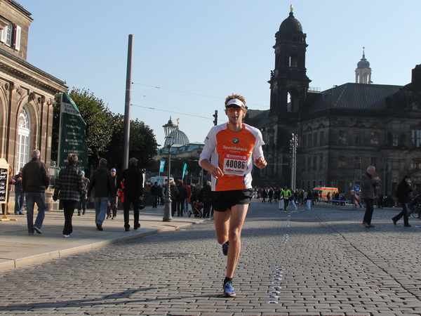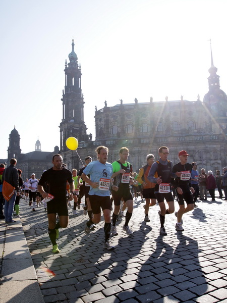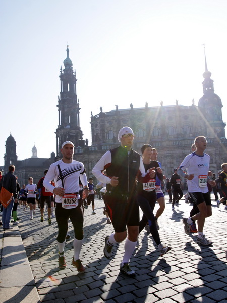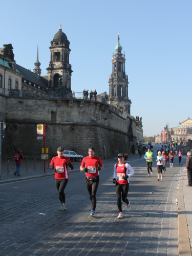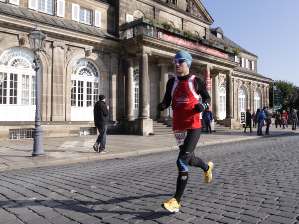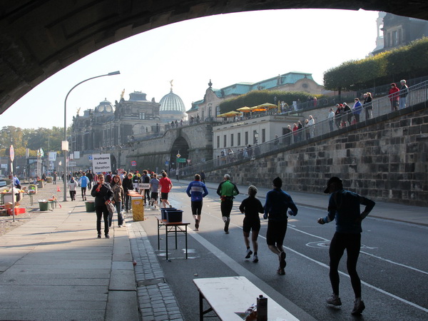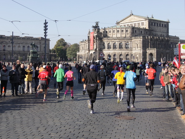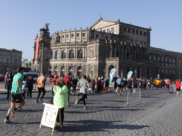 Am Abzweig bei der Semperoper müssen wir uns scharf rechts halten, während die Halben den letzen Halben (Kilometer) in Angriff nehmen. Der größere Teil der Läufer biegt links ab. Sofort ist es ruhiger im Feld.