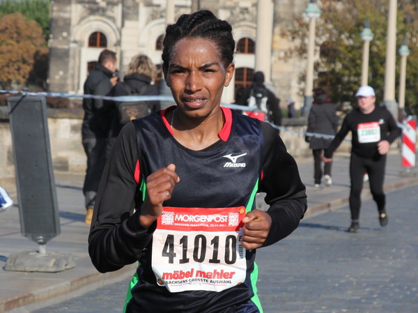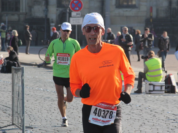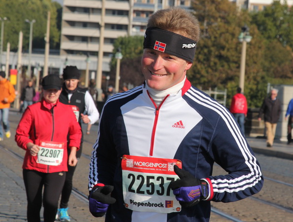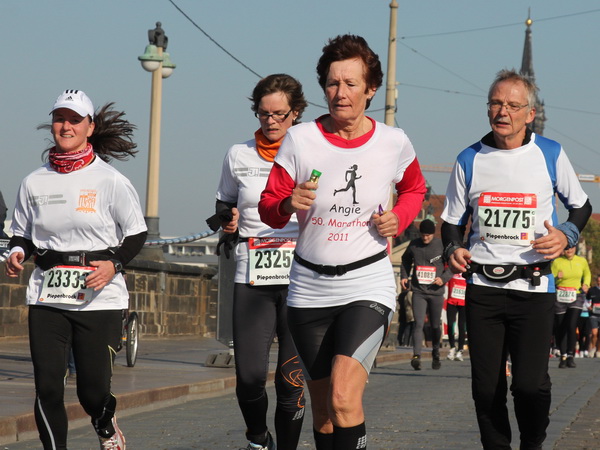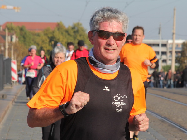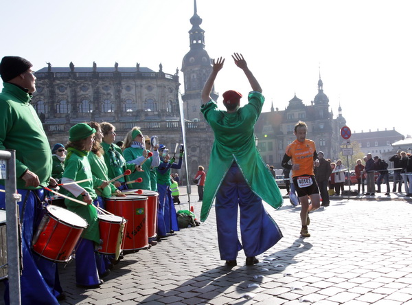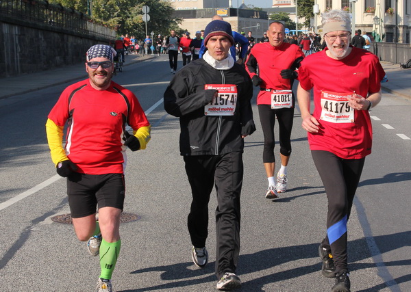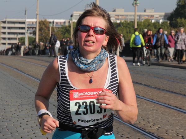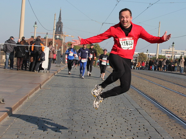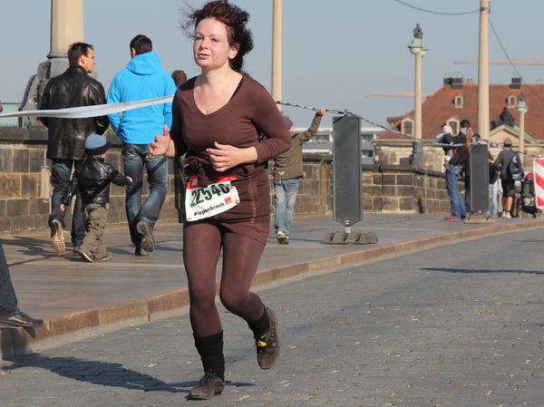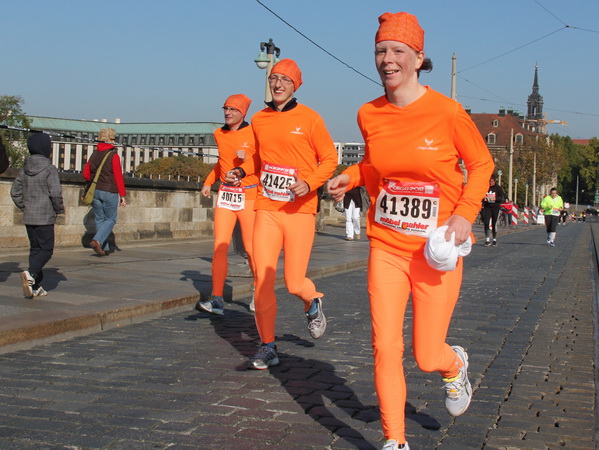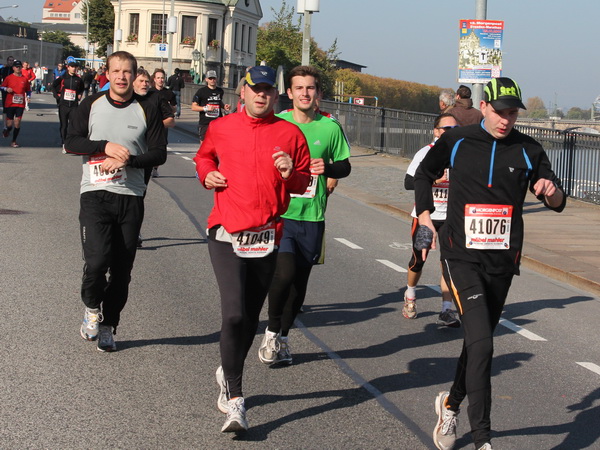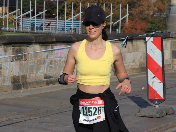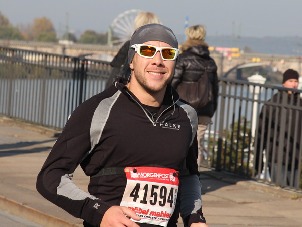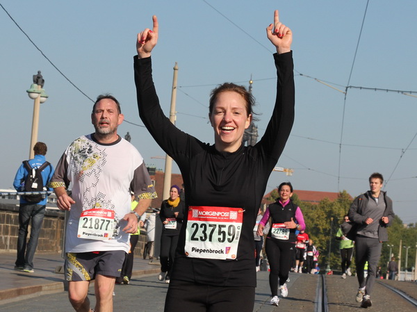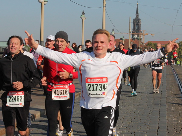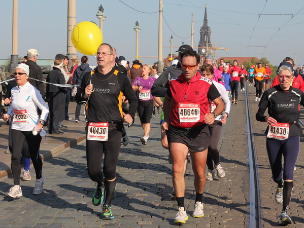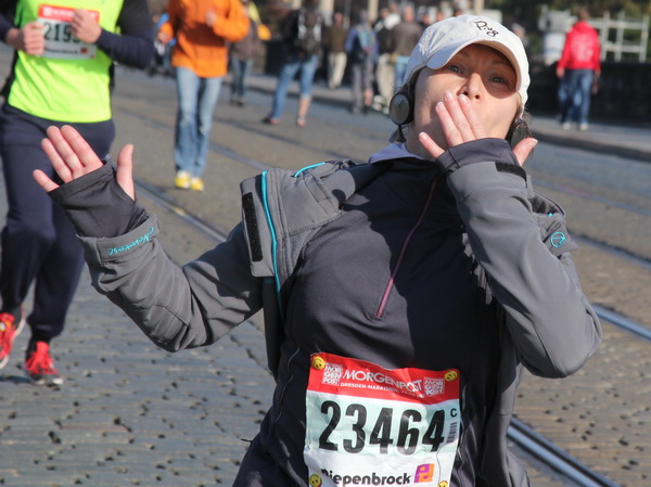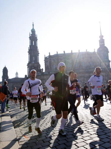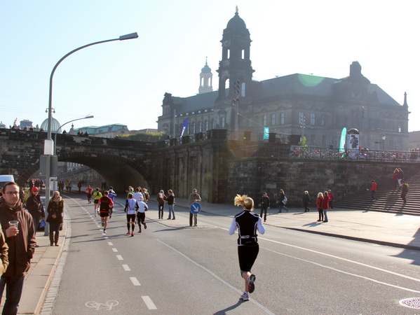 Kurz nach Kilometer 19 verlassen wir das Elbufer leicht ansteigend Richtung Große Meißner Straße. Die Halbmarathonis haben ihr Tempo angezogen. Der Goldene Reiter zeigt uns später seinen Hintern, was August der Starke bei unserem Vorbeilaufen ebenfalls nicht erspart bleibt. Aus der Konserve höre ich den Malle-Hit „Sex On The Beach“. Ja, da geht heute nix mehr. Is’ zu kalt und außerdem is’ nach der Rennerei eh Feierabend. Zum vierten Mal überqueren wir die Elbe auf der Augustusbrücke. Die leichte Steigung von Neustadt her kommend spürt man schon in den Beinen.