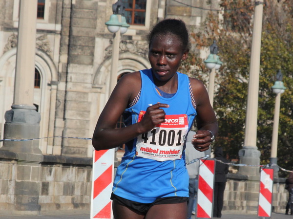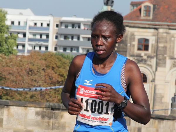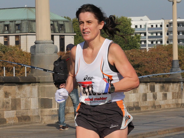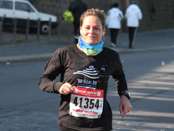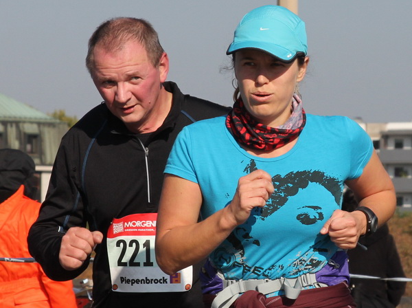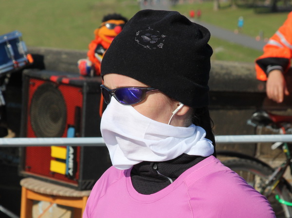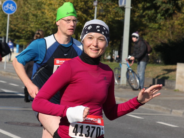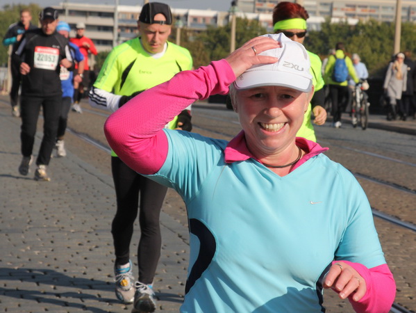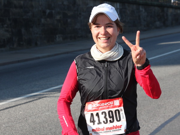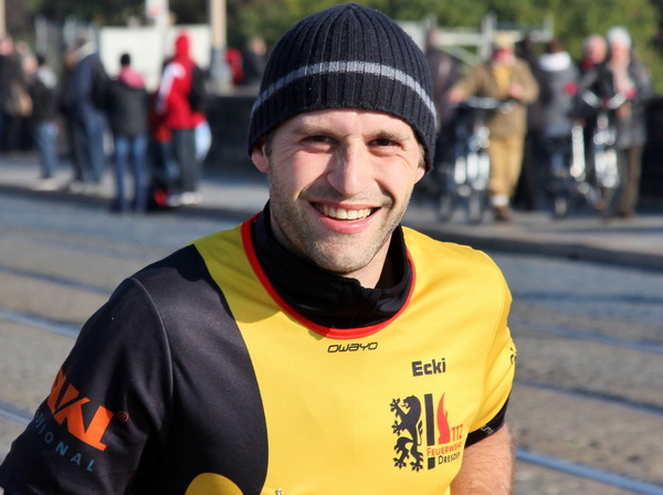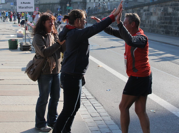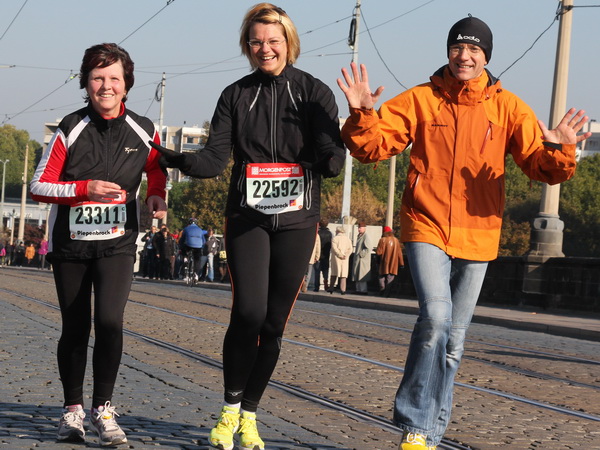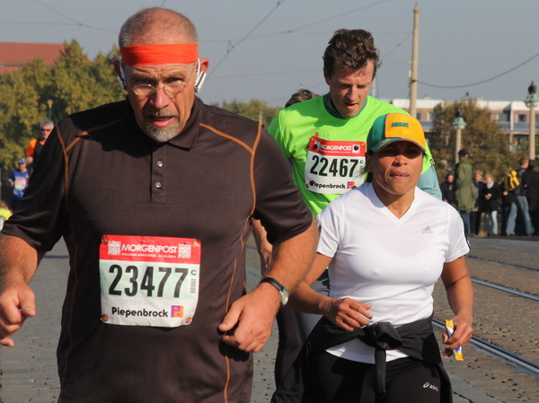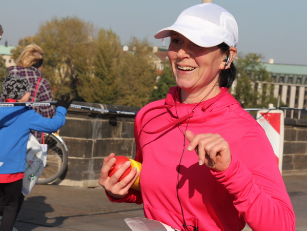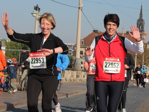 Auf in die Zweite Runde: An zwei Stellen unterscheidet sich die zweite Runde von der ersten. Der erste Unterschied ist gleich am Anfang, wo wir nach der Carolabrücke für rund zwei Kilometer auf dem Elberadweg rennen. Zwei eifrige Dresdnerinnen halten es an diesem leicht zugigen Ort auf, denn der Wind weht leicht von Osten. Eine hat einen Kopfschmuck mit zwei Händen in schwarz-rot-gold-Farbe oben drauf.