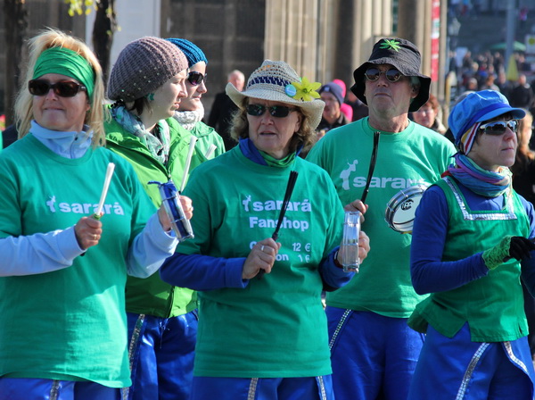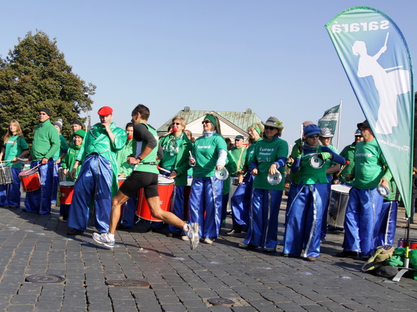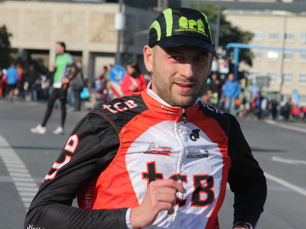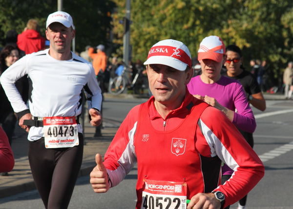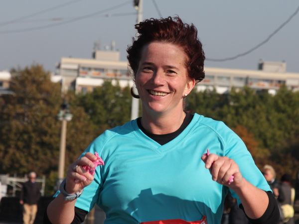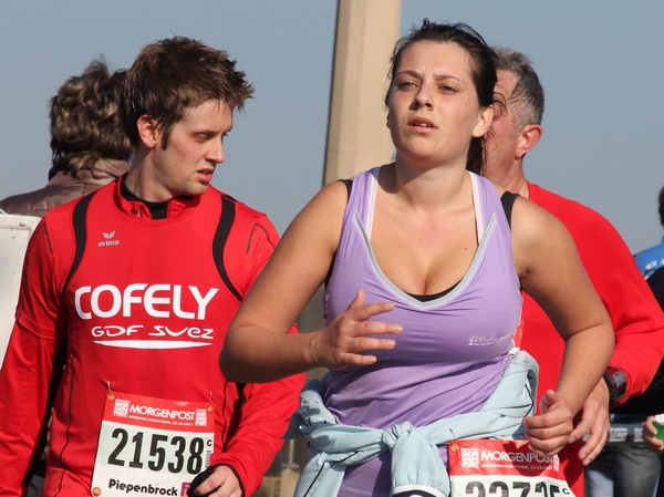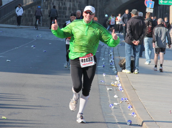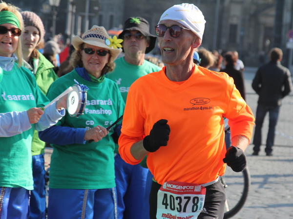 Wir biegen rechts in die ellenlange Fetscherstraße ab. Über zwei Kilometer geht es hier nur geradeaus, doch Sambabands, Cheerleader-Girls, Wasserstellen und der Gegenverkehrsbereich lockern das ganze auf. Klar, dass bei den Sambas sich die Zuschauer versammeln und mitmachen. Auf der anderen Seite kommt uns die Männerspitze entgegen, die hier schon fünf Kilometer mehr unter den Füßen hat.