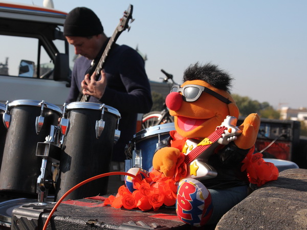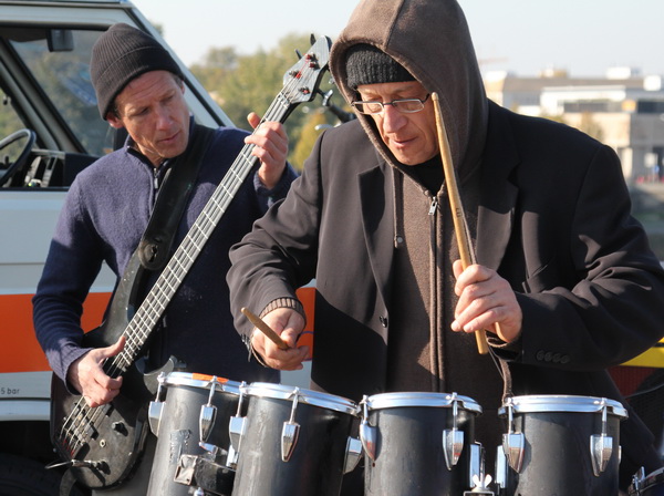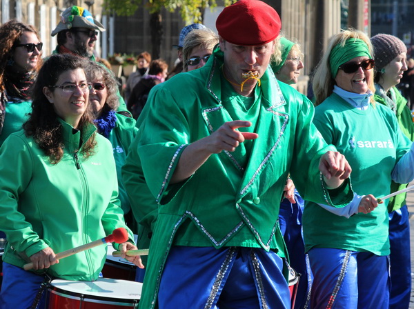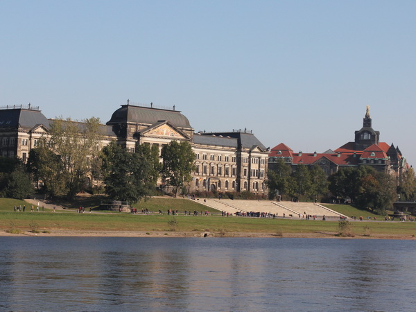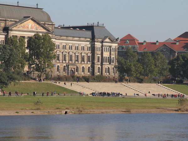 Nach drei Rechtskurven auf der Wigard-Straße, dem Rosa-Luxemburg-Platz und dem Uferweg an der Elbe haben wir die Sächsische Staatskanzlei, Amtssitz des Ministerpräsidenten, umrundet. Unser weiterer Weg verläuft nun auf den Elbwiesen. Ein schöner Blick bietet sich hier dem Betrachter auf die jenseitigen Elbterrassen. Dann sehe ich meinen Chefredakteur bei seiner liebsten Arbeit. Bei einer Sambagruppe schießt er Bilder und nimmt mich auch aufs Korn. Hoffentlich bin ich für ein scharfes Bild nicht zu schnell.